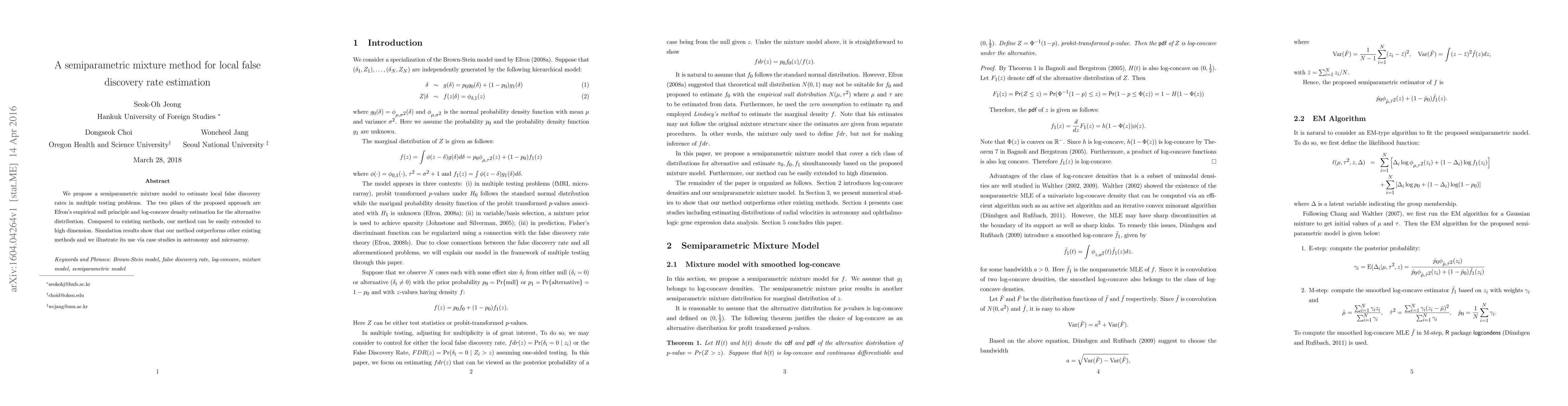 We propose a semiparametric mixture model to estimate local false discovery rates in multiple testing problems. The two pilars of the proposed approach are Efron's empirical null principle and log-concave density estimation for the alternative distribution. Compared to existing methods, our method can be easily extended to high dimension. Simulation results show that our method outperforms other existing methods and we illustrate its use via case studies in astronomy and microarray.
