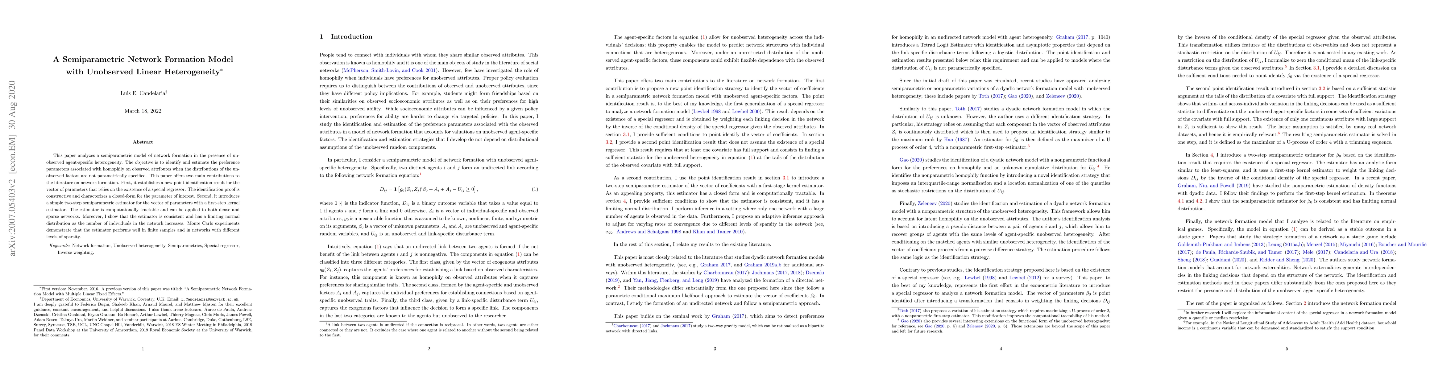 This paper proposes a semiparametric model for network formation with unobserved linear heterogeneity, establishing a new identification result and introducing a two-step estimator for parameter estimation. The estimator is shown to be consistent and performs well in simulations across various network densities.
