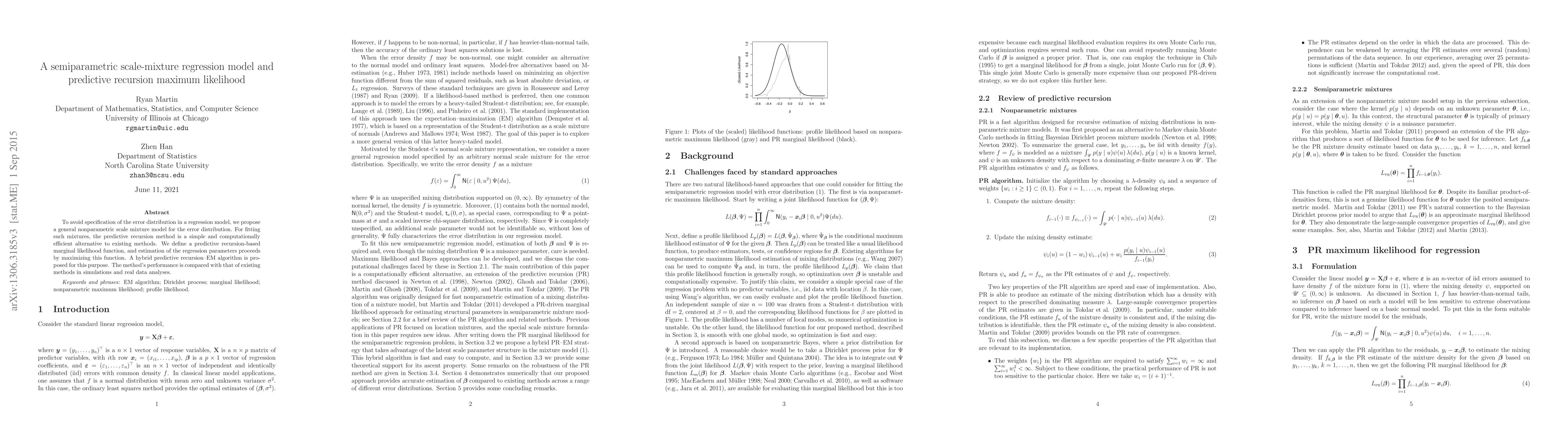 This paper proposes a semiparametric scale-mixture regression model to avoid specifying the error distribution, using a predictive recursion-based marginal likelihood function for estimation. A hybrid predictive recursion-EM algorithm is developed for efficient parameter estimation, and its performance is compared with existing methods.