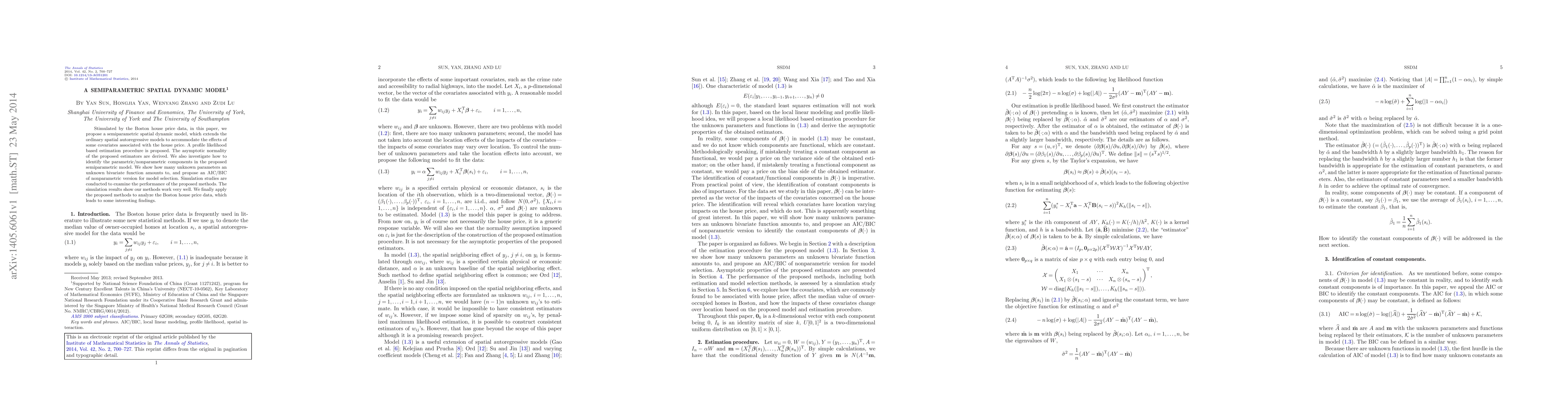 Stimulated by the Boston house price data, in this paper, we propose a semiparametric spatial dynamic model, which extends the ordinary spatial autoregressive models to accommodate the effects of some covariates associated with the house price. A profile likelihood based estimation procedure is proposed. The asymptotic normality of the proposed estimators are derived. We also investigate how to identify the parametric/nonparametric components in the proposed semiparametric model. We show how many unknown parameters an unknown bivariate function amounts to, and propose an AIC/BIC of nonparametric version for model selection. Simulation studies are conducted to examine the performance of the proposed methods. The simulation results show our methods work very well. We finally apply the proposed methods to analyze the Boston house price data, which leads to some interesting findings.