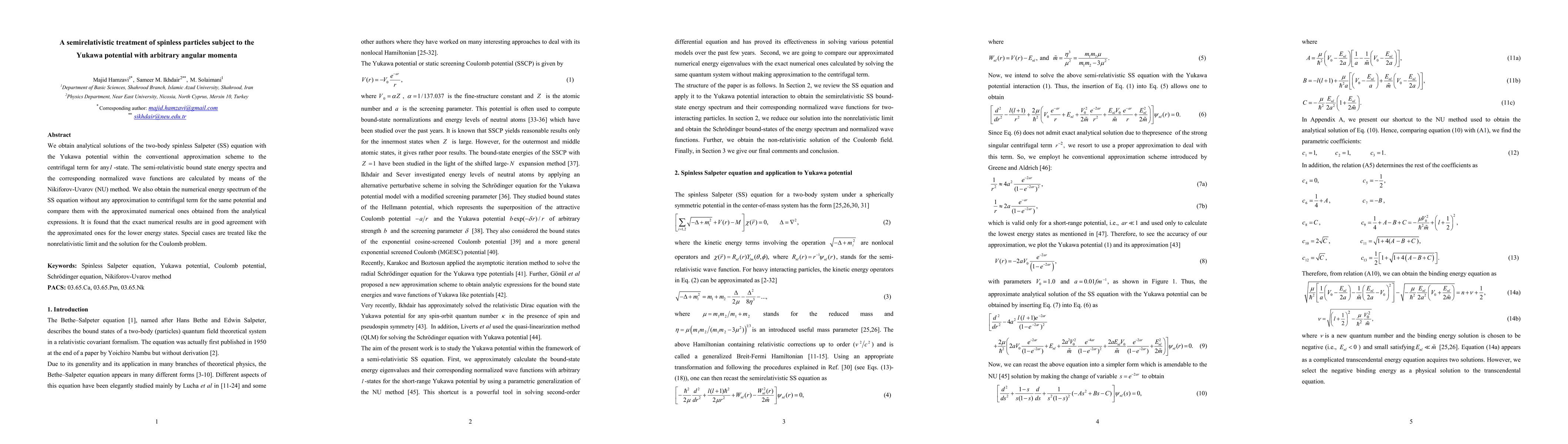 We obtain analytical solutions of the two-body spinless Salpeter (SS) equation with Yukawa potential within the conventional approximation scheme to the centrifugal term for any -state. The semi-relativistic bound state energy spectra and the corresponding normalized wave functions are calculated by means of the Nikiforov-Uvarov (NU) method. We also obtain the numerical energy spectrum of the SS equation without any approximation to centrifugal term for the same potential and compare them with the approximated numerical ones obtained from the analytical expressions. It is found that the exact numerical results are in good agreement with the approximated ones for the lower energy states. Special cases are treated like the nonrelativistic limit and the solution for the Coulomb problem.