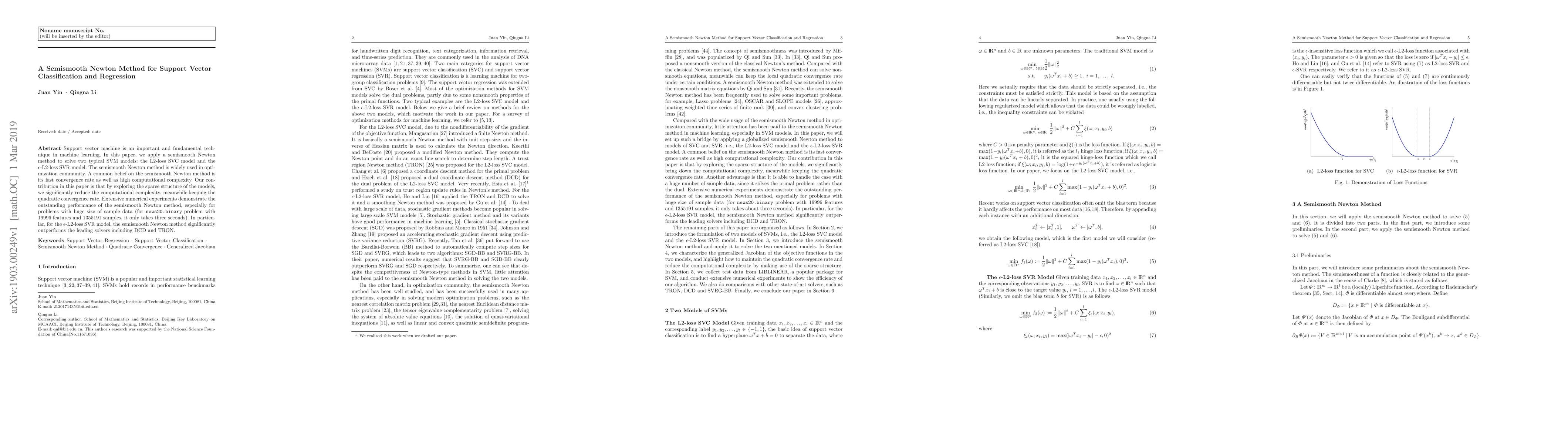This paper proposes a semismooth Newton method to efficiently solve large-scale Support Vector Classification (SVC) and Support Vector Regression (SVR) models, significantly reducing computational complexity while maintaining fast convergence. Numerical experiments show superior performance, especially for massive datasets.