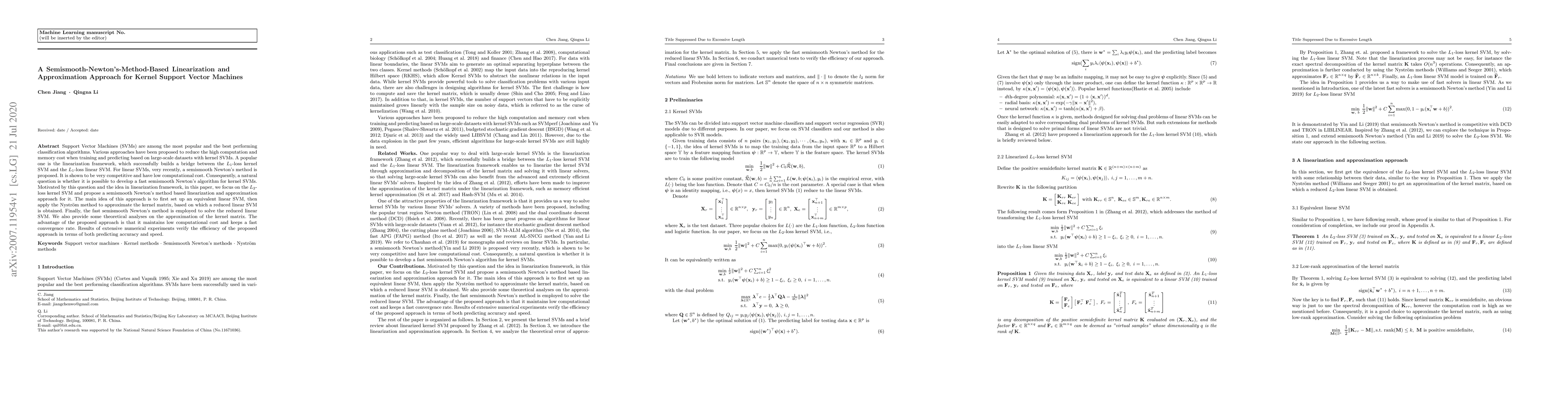 This paper proposes a semismooth Newton's method-based linearization and approximation approach for $L_2$-loss kernel Support Vector Machines (SVMs) to reduce computational costs. The method involves setting up an equivalent linear SVM, approximating the kernel matrix using the Nyström method, and solving the reduced linear SVM with the fast semismooth Newton's method, achieving both low computational cost and fast convergence.