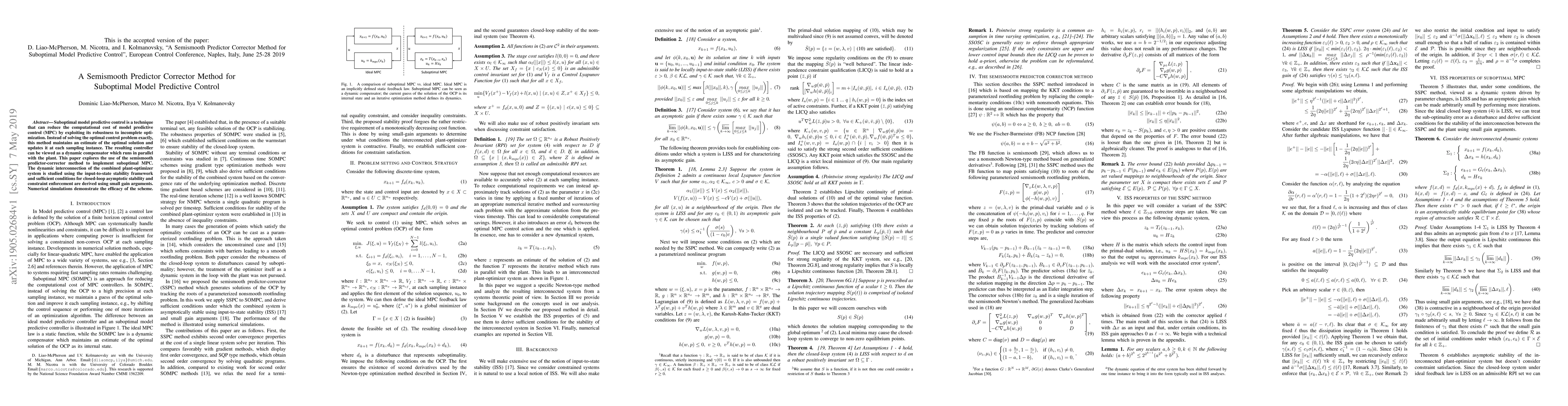 Suboptimal model predictive control is a technique that can reduce the computational cost of model predictive control (MPC) by exploiting its robustness to incomplete optimization. Instead of solving the optimal control problem exactly, this method maintains an estimate of the optimal solution and updates it at each sampling instance. The resulting controller can be viewed as a dynamic compensator which runs in parallel with the plant. This paper explores the use of the semismooth predictor-corrector method to implement suboptimal MPC. The dynamic interconnection of the combined plant-optimizer system is studied using the input-to-state stability framework and sufficient conditions for closed-loop asymptotic stability and constraint enforcement are derived using small gain arguments. Numerical simulations demonstrate the efficacy of the scheme.