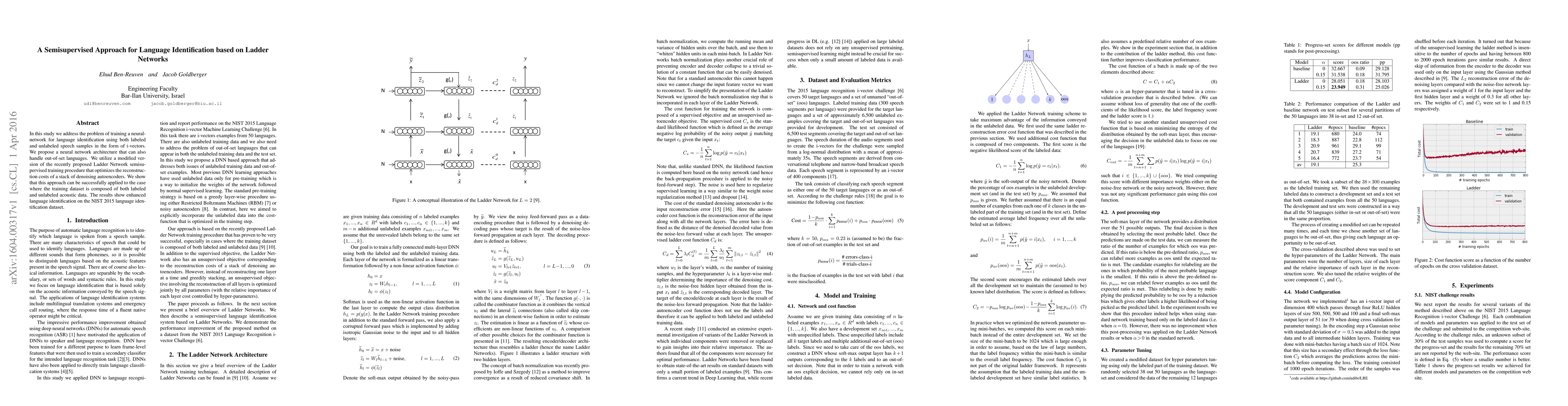 In this study we address the problem of training a neuralnetwork for language identification using both labeled and unlabeled speech samples in the form of i-vectors. We propose a neural network architecture that can also handle out-of-set languages. We utilize a modified version of the recently proposed Ladder Network semisupervised training procedure that optimizes the reconstruction costs of a stack of denoising autoencoders. We show that this approach can be successfully applied to the case where the training dataset is composed of both labeled and unlabeled acoustic data. The results show enhanced language identification on the NIST 2015 language identification dataset.