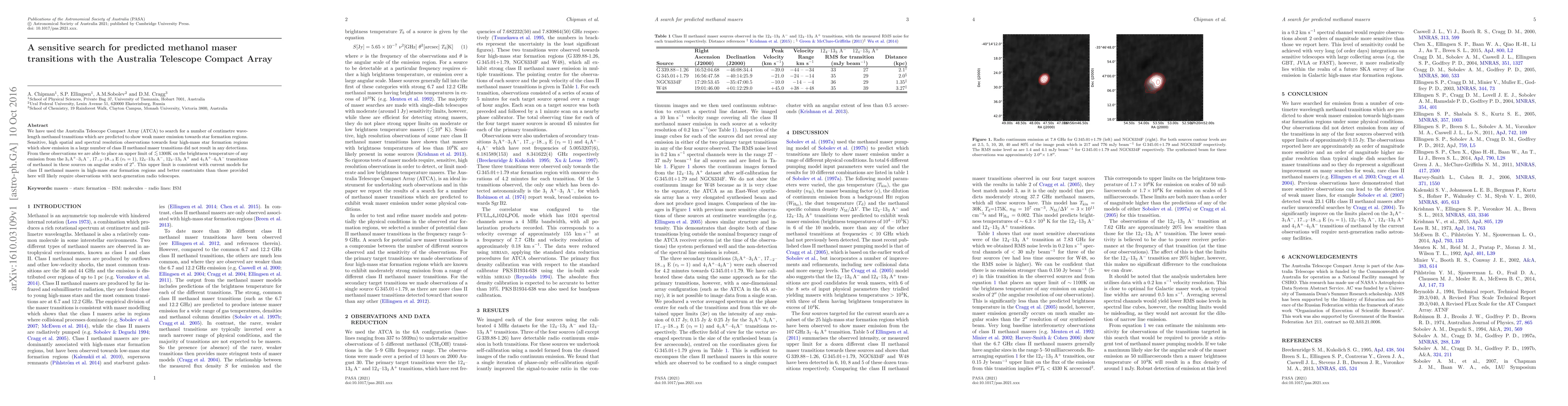 We have used the Australia Telescope Compact Array (ATCA) to search for a number of centimetre wavelength methanol transitions which are predicted to show weak maser emission towards star formation regions. Sensitive, high spatial and spectral resolution observations towards four high-mass star formation regions which show emission in a large number of class II methanol maser transitions did not result in any detections. From these observations we are able to place an upper limit of <~1300K on the brightness temperature of any emission from the $3_1$A$^+$-$3_1$A$^-$, $17_{-2}$-$18_{-3}$E ($v_t=1$), $12_4$-$13_3$A$^-$, $12_4$-$13_3$A$^+$ and $4_1$A$^+$-$4_1$A$^-$ transitions of methanol in these sources on angular scales of 2 arcseconds. This upper limit is consistent with current models for class II methanol masers in high-mass star formation regions and better constraints than those provided here will likely require observations with next-generation radio telescopes.