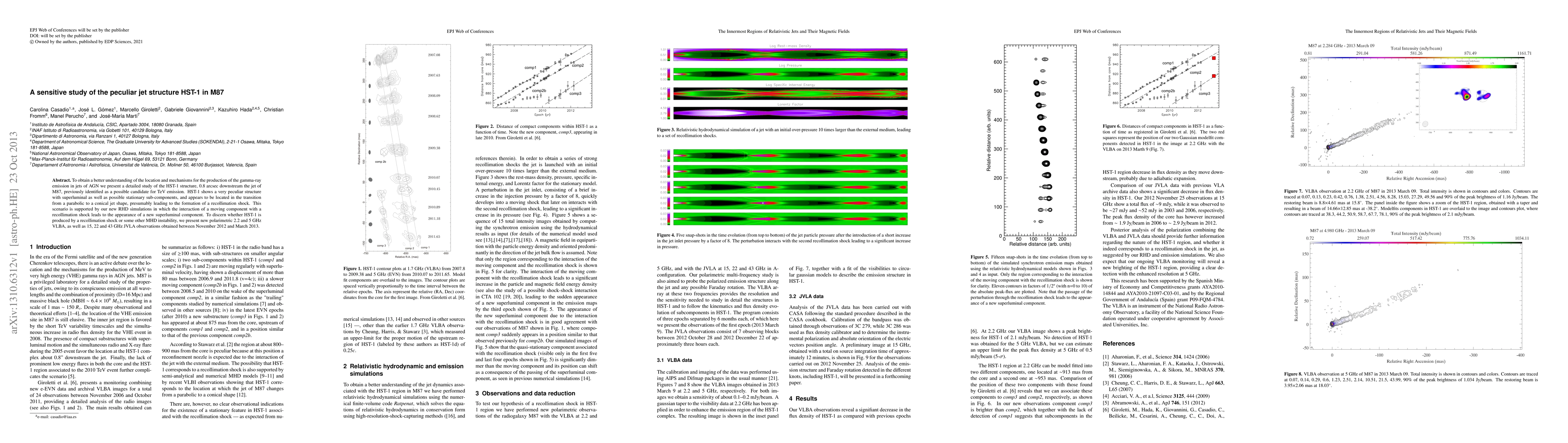 To obtain a better understanding of the location and mechanisms for the production of the gamma-ray emission in jets of AGN we present a detailed study of the HST-1 structure, 0.8 arcsec downstream the jet of M87, previously identified as a possible candidate for TeV emission. HST-1 shows a very peculiar structure with superluminal as well as possible stationary sub-components, and appears to be located in the transition from a parabolic to a conical jet shape, presumably leading to the formation of a recollimation shock. This scenario is supported by our new RHD simulations in which the interaction of a moving component with a recollimation shock leads to the appearance of a new superluminal component. To discern whether HST-1 is produced by a recollimation shock or some other MHD instability, we present new polarimetric 2.2 and 5 GHz VLBA, as well as 15, 22 and 43 GHz JVLA observations obtained between November 2012 and March 2013.