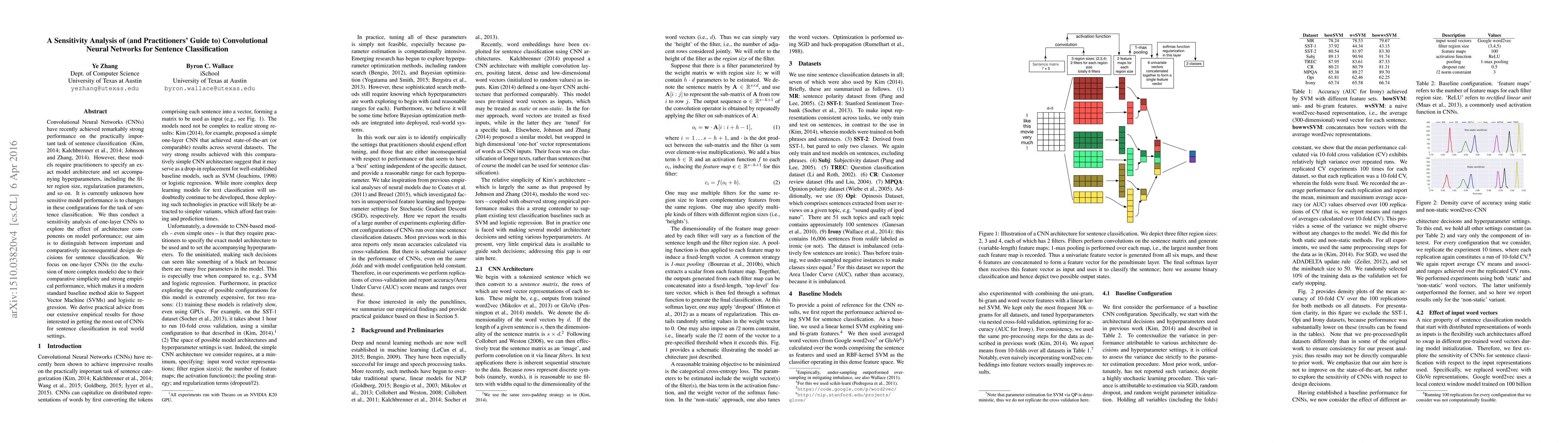 Convolutional Neural Networks (CNNs) have recently achieved remarkably strong performance on the practically important task of sentence classification (kim 2014, kalchbrenner 2014, johnson 2014). However, these models require practitioners to specify an exact model architecture and set accompanying hyperparameters, including the filter region size, regularization parameters, and so on. It is currently unknown how sensitive model performance is to changes in these configurations for the task of sentence classification. We thus conduct a sensitivity analysis of one-layer CNNs to explore the effect of architecture components on model performance; our aim is to distinguish between important and comparatively inconsequential design decisions for sentence classification. We focus on one-layer CNNs (to the exclusion of more complex models) due to their comparative simplicity and strong empirical performance, which makes it a modern standard baseline method akin to Support Vector Machine (SVMs) and logistic regression. We derive practical advice from our extensive empirical results for those interested in getting the most out of CNNs for sentence classification in real world settings.