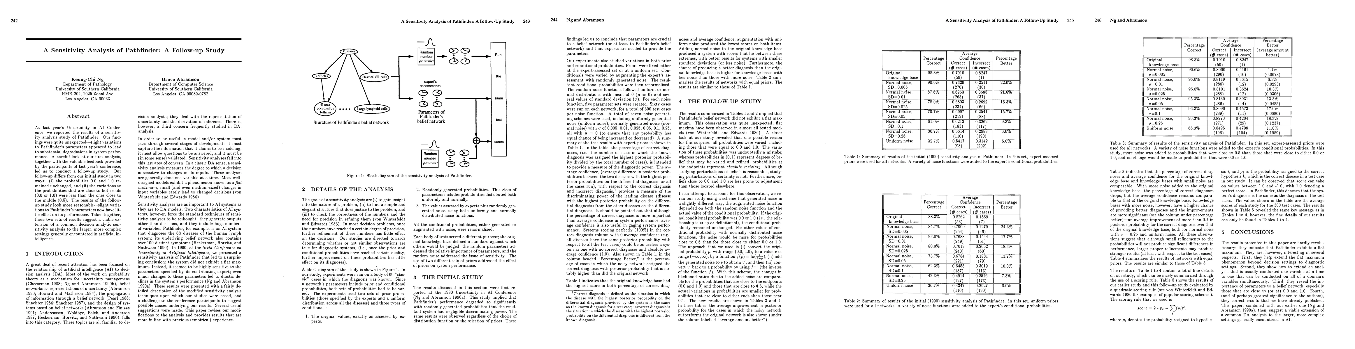 At last year?s Uncertainty in AI Conference, we reported the results of a sensitivity analysis study of Pathfinder. Our findings were quite unexpected-slight variations to Pathfinder?s parameters appeared to lead to substantial degradations in system performance. A careful look at our first analysis, together with the valuable feedback provided by the participants of last year?s conference, led us to conduct a follow-up study. Our follow-up differs from our initial study in two ways: (i) the probabilities 0.0 and 1.0 remained unchanged, and (ii) the variations to the probabilities that are close to both ends (0.0 or 1.0) were less than the ones close to the middle (0.5). The results of the follow-up study look more reasonable-slight variations to Pathfinder?s parameters now have little effect on its performance. Taken together, these two sets of results suggest a viable extension of a common decision analytic sensitivity analysis to the larger, more complex settings generally encountered in artificial intelligence.