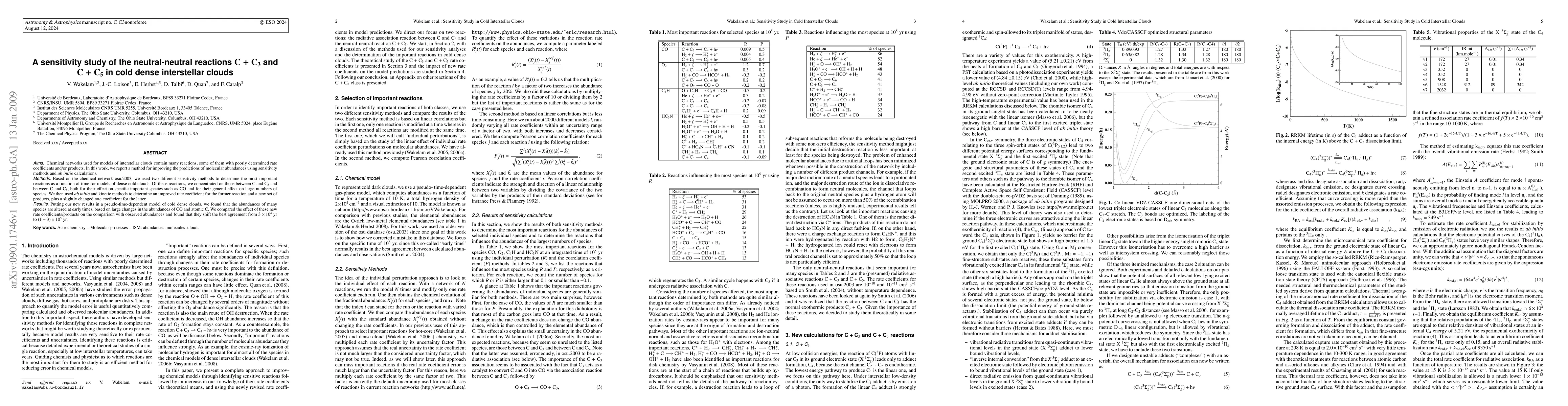 Researchers used sensitivity methods and ab initio calculations to improve predictions of molecular abundances in interstellar clouds, finding that new rate coefficients for neutral-neutral reactions C + C3 and C + C5 altered species abundances at early times.