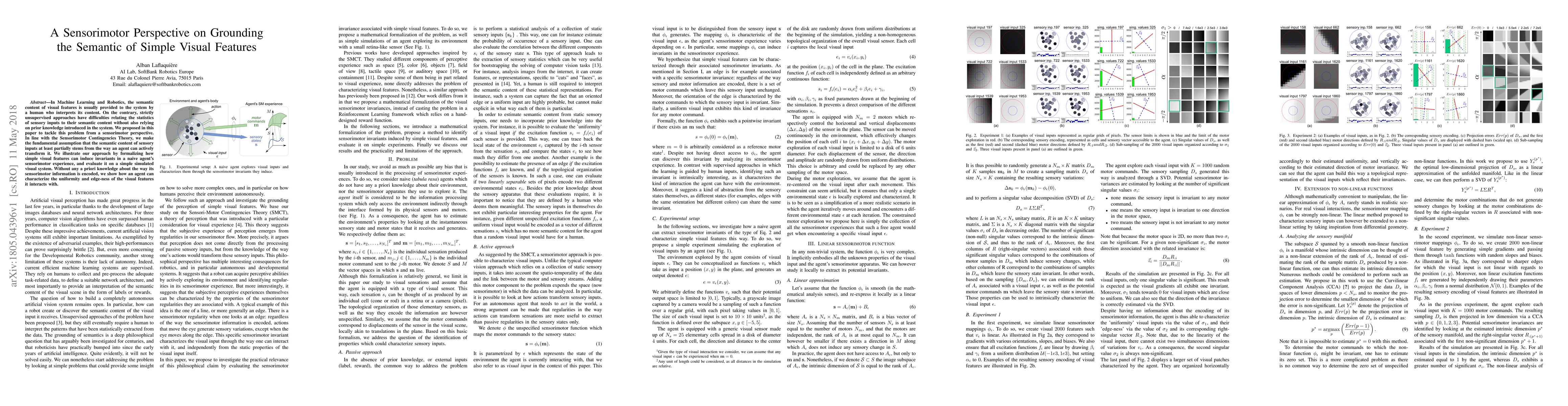 In Machine Learning and Robotics, the semantic content of visual features is usually provided to the system by a human who interprets its content. On the contrary, strictly unsupervised approaches have difficulties relating the statistics of sensory inputs to their semantic content without also relying on prior knowledge introduced in the system. We proposed in this paper to tackle this problem from a sensorimotor perspective. In line with the Sensorimotor Contingencies Theory, we make the fundamental assumption that the semantic content of sensory inputs at least partially stems from the way an agent can actively transform it. We illustrate our approach by formalizing how simple visual features can induce invariants in a naive agent's sensorimotor experience, and evaluate it on a simple simulated visual system. Without any a priori knowledge about the way its sensorimotor information is encoded, we show how an agent can characterize the uniformity and edge-ness of the visual features it interacts with.