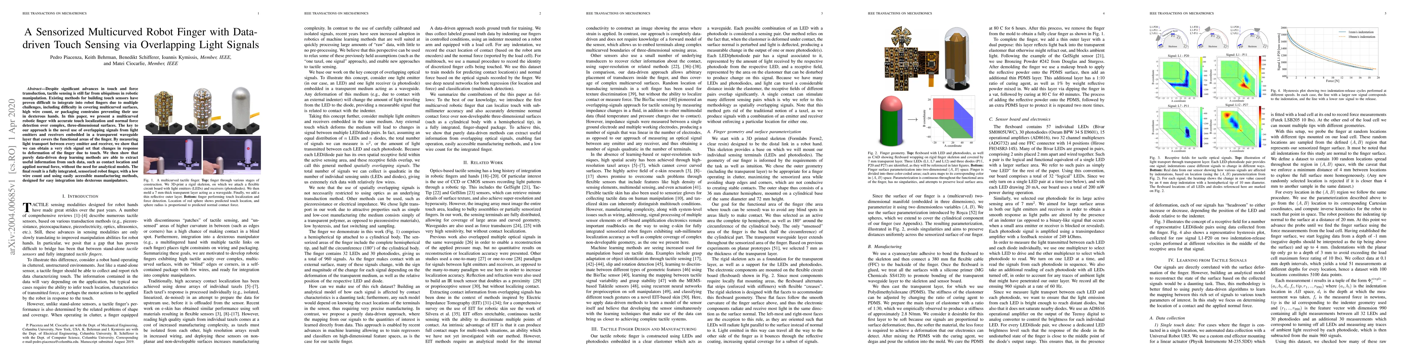 This paper introduces a novel sensorized robotic finger with data-driven touch sensing using overlapping light signals. It addresses the challenges of integrating tactile sensors into multicurved surfaces by employing a transparent waveguide layer with embedded light emitters and receivers, enabling accurate touch localization and force detection through deep learning.