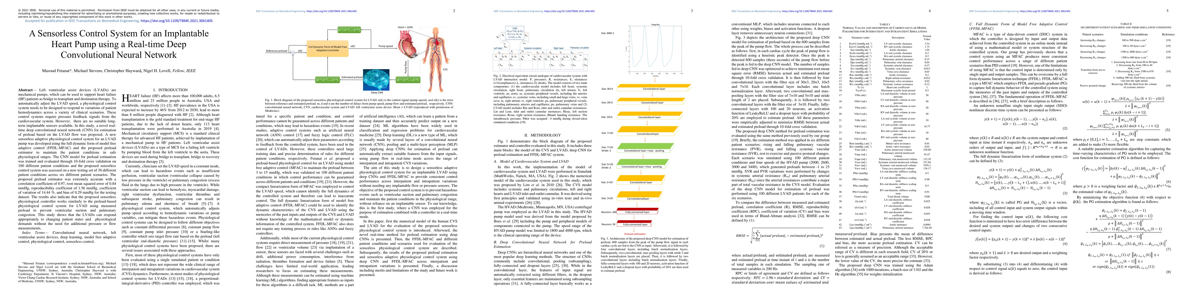 A novel sensorless control system using a deep convolutional neural network was developed to adjust an implantable heart pump's speed in response to patient hemodynamics. The system achieved accurate preload estimation and successfully prevented ventricular suction and pulmonary congestion without requiring additional pressure or flow measurements.