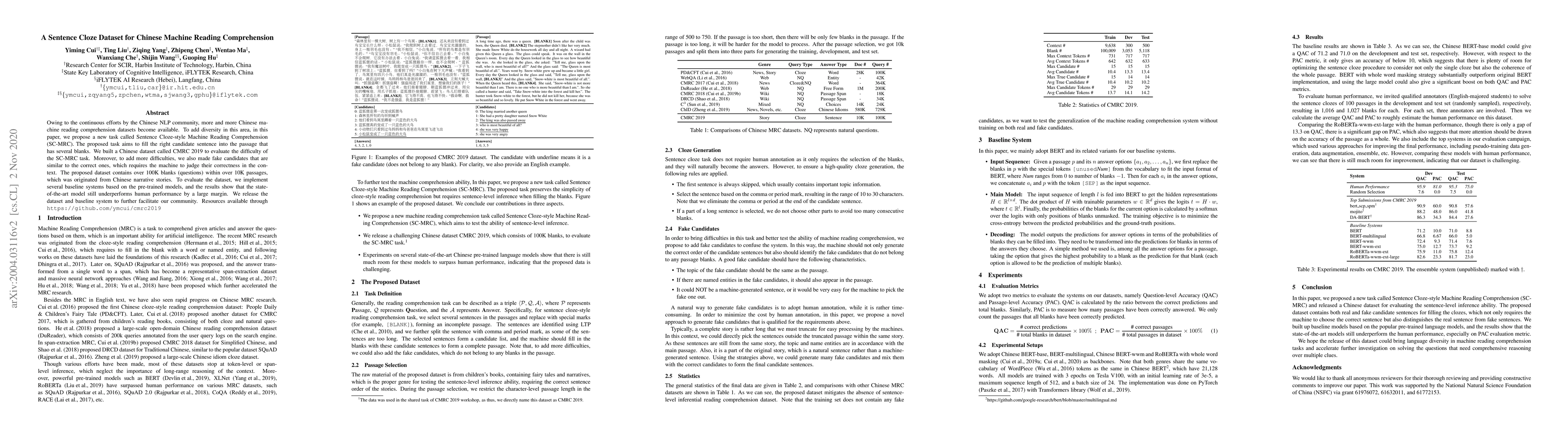 This paper introduces a new Sentence Cloze-style Machine Reading Comprehension (SC-MRC) task, building a dataset called CMRC 2019 with over 100K blanks in 10K passages from Chinese stories. The dataset includes difficult fake candidates to test model discernment, and initial baseline results show significant room for improvement compared to human performance.