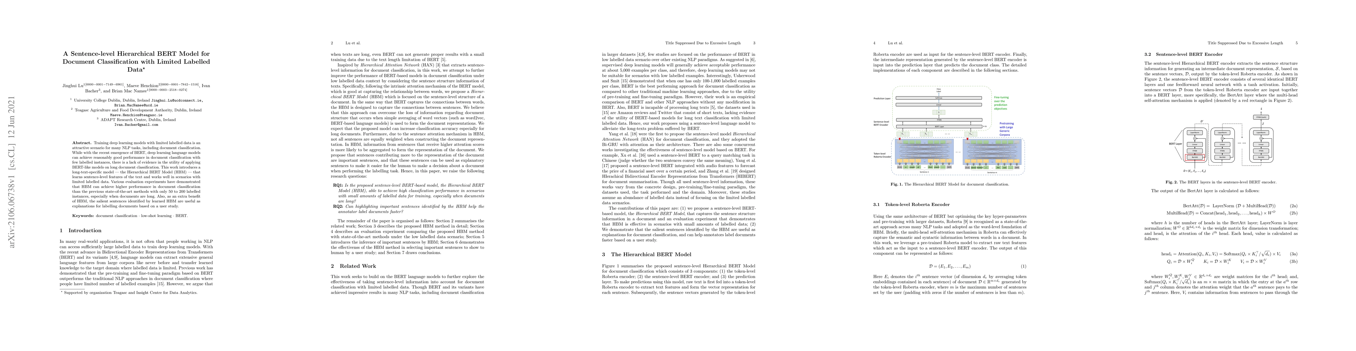 Training deep learning models with limited labelled data is an attractive scenario for many NLP tasks, including document classification. While with the recent emergence of BERT, deep learning language models can achieve reasonably good performance in document classification with few labelled instances, there is a lack of evidence in the utility of applying BERT-like models on long document classification. This work introduces a long-text-specific model -- the Hierarchical BERT Model (HBM) -- that learns sentence-level features of the text and works well in scenarios with limited labelled data. Various evaluation experiments have demonstrated that HBM can achieve higher performance in document classification than the previous state-of-the-art methods with only 50 to 200 labelled instances, especially when documents are long. Also, as an extra benefit of HBM, the salient sentences identified by learned HBM are useful as explanations for labelling documents based on a user study.