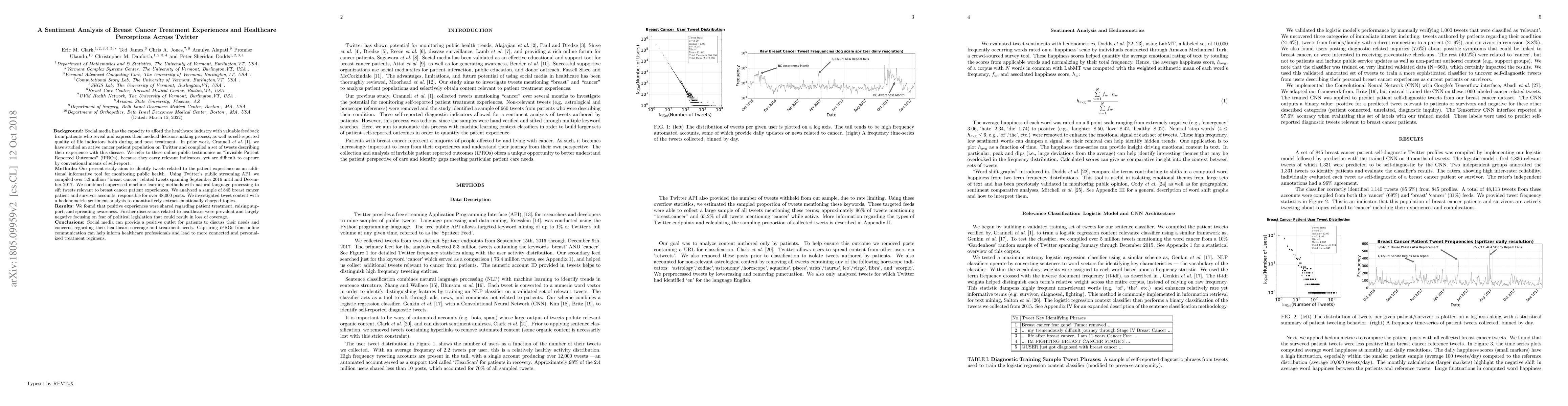 Background: Social media has the capacity to afford the healthcare industry with valuable feedback from patients who reveal and express their medical decision-making process, as well as self-reported quality of life indicators both during and post treatment. In prior work, [Crannell et. al.], we have studied an active cancer patient population on Twitter and compiled a set of tweets describing their experience with this disease. We refer to these online public testimonies as "Invisible Patient Reported Outcomes" (iPROs), because they carry relevant indicators, yet are difficult to capture by conventional means of self-report. Methods: Our present study aims to identify tweets related to the patient experience as an additional informative tool for monitoring public health. Using Twitter's public streaming API, we compiled over 5.3 million "breast cancer" related tweets spanning September 2016 until mid December 2017. We combined supervised machine learning methods with natural language processing to sift tweets relevant to breast cancer patient experiences. We analyzed a sample of 845 breast cancer patient and survivor accounts, responsible for over 48,000 posts. We investigated tweet content with a hedonometric sentiment analysis to quantitatively extract emotionally charged topics. Results: We found that positive experiences were shared regarding patient treatment, raising support, and spreading awareness. Further discussions related to healthcare were prevalent and largely negative focusing on fear of political legislation that could result in loss of coverage. Conclusions: Social media can provide a positive outlet for patients to discuss their needs and concerns regarding their healthcare coverage and treatment needs. Capturing iPROs from online communication can help inform healthcare professionals and lead to more connected and personalized treatment regimens.