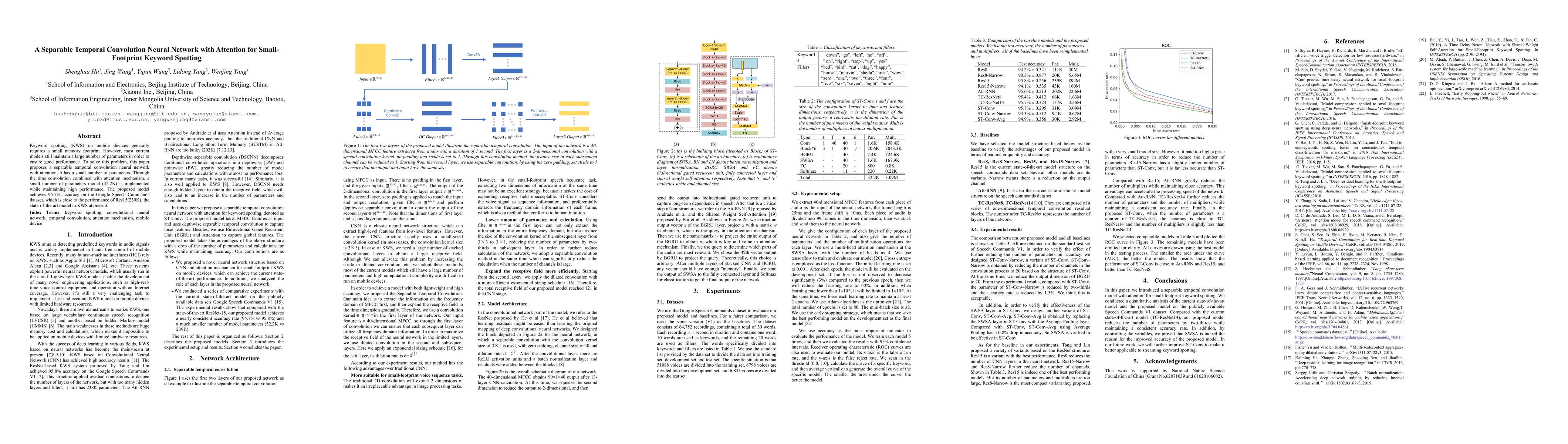 This paper proposes a separable temporal convolution neural network with attention for small-footprint keyword spotting, achieving high performance with only 32.2K parameters. The model achieves 95.7% accuracy on the Google Speech Commands dataset, nearly matching the performance of the state-of-the-art Res15 model.
