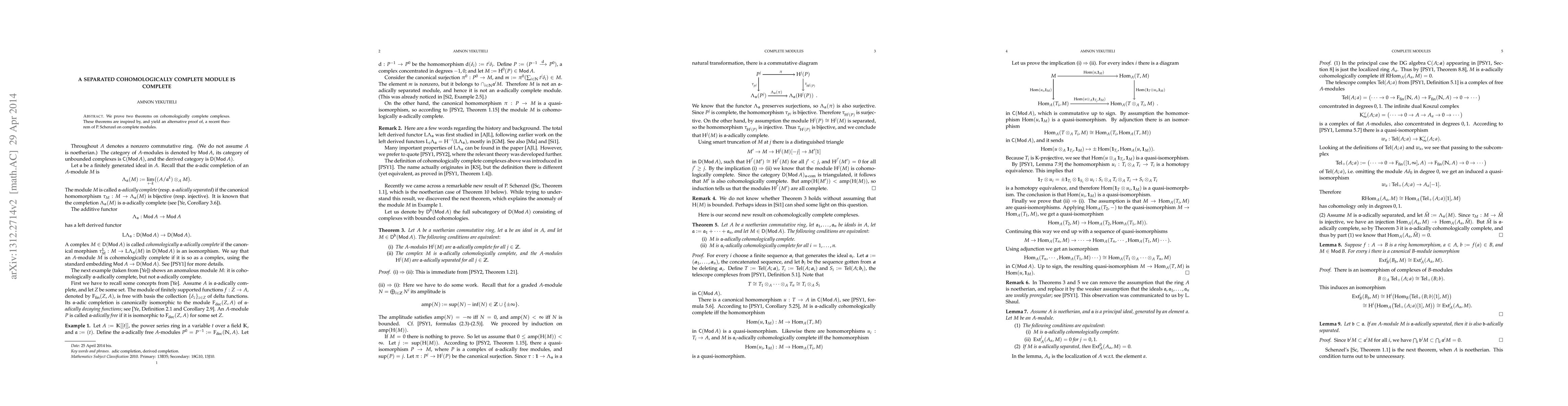 Summary: This paper proves two theorems regarding cohomologically complete complexes, providing an alternative proof for a recent theorem by P. Schenzel on complete modules, thereby establishing that a separated cohomologically complete module is indeed complete.