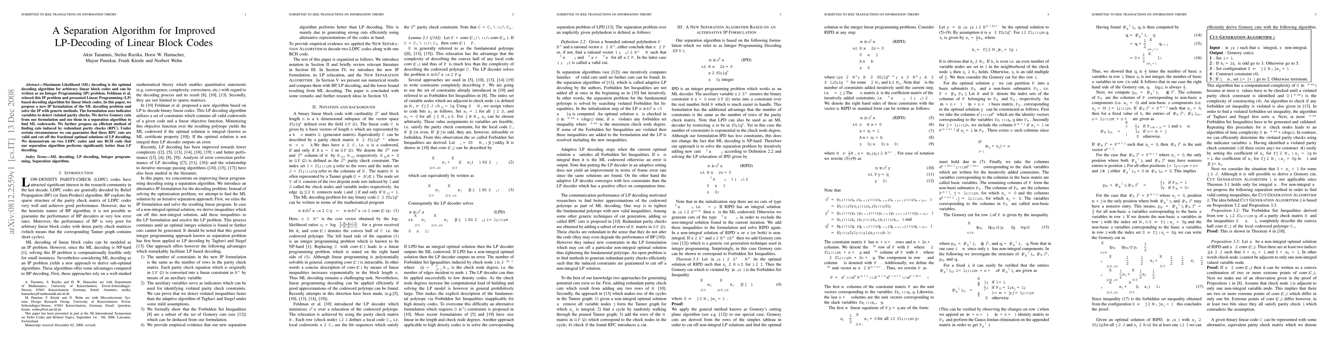 Maximum Likelihood (ML) decoding is the optimal decoding algorithm for arbitrary linear block codes and can be written as an Integer Programming (IP) problem. Feldman et al. relaxed this IP problem and presented Linear Programming (LP) based decoding algorithm for linear block codes. In this paper, we propose a new IP formulation of the ML decoding problem and solve the IP with generic methods. The formulation uses indicator variables to detect violated parity checks. We derive Gomory cuts from our formulation and use them in a separation algorithm to find ML codewords. We further propose an efficient method of finding cuts induced by redundant parity checks (RPC). Under certain circumstances we can guarantee that these RPC cuts are valid and cut off the fractional optimal solutions of LP decoding. We demonstrate on two LDPC codes and one BCH code that our separation algorithm performs significantly better than LP decoding.