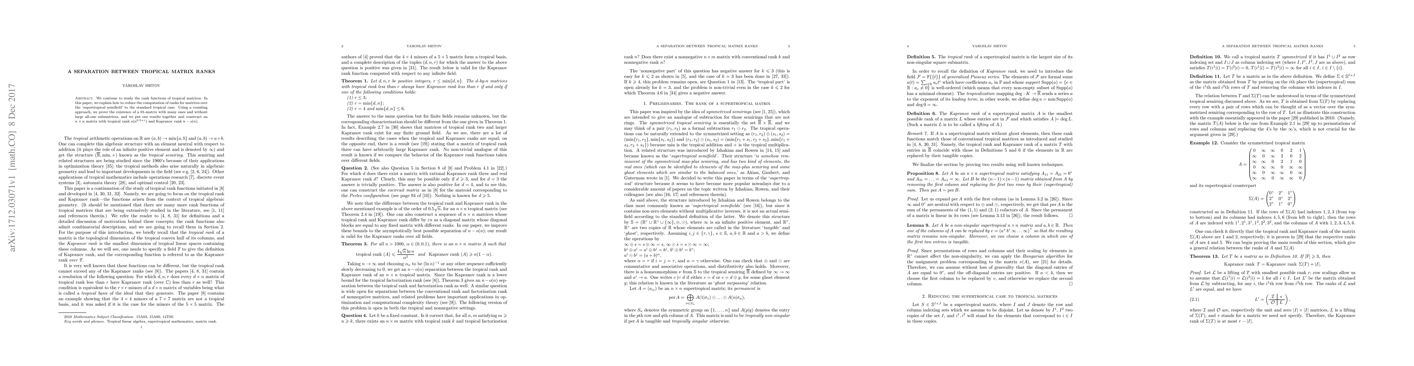 This paper explores the rank functions of tropical matrices, demonstrating how to reduce computations over the supertropical semifield to standard tropical ranks. It constructs an $n\times n$ matrix with tropical rank $o(n^{0.5+\varepsilon})$ and Kapranov rank $n-o(n)$, highlighting a significant separation between these two rank measures.