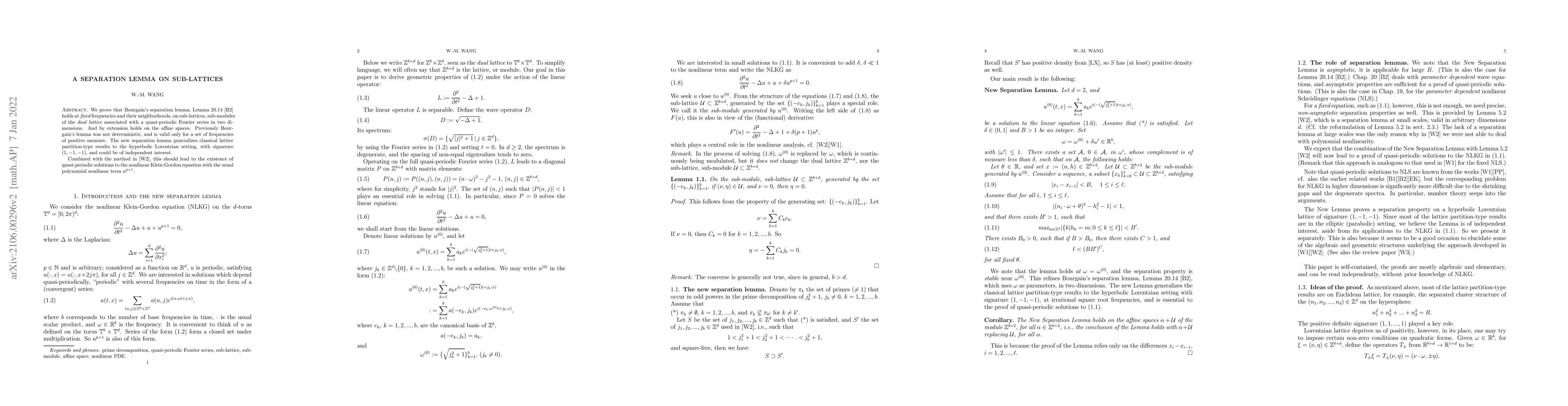 We prove that Bourgain's separation lemma, Lemma~20.14 [B2] holds at fixed frequencies and their neighborhoods, on sub-lattices, sub-modules of the dual lattice associated with a quasi-periodic Fourier series in two dimensions. And by extension holds on the affine spaces. Previously Bourgain's lemma was not deterministic, and is valid only for a set of frequencies of positive measure. The new separation lemma generalizes classical lattice partition-type results to the hyperbolic Lorentzian setting, with signature $(1, -1, -1)$, and could be of independent interest. Combined with the method in [W2], this should lead to the existence of quasi-periodic solutions to the nonlinear Klein-Gordon equation with the usual polynomial nonlinear term $u^{p+1}$.