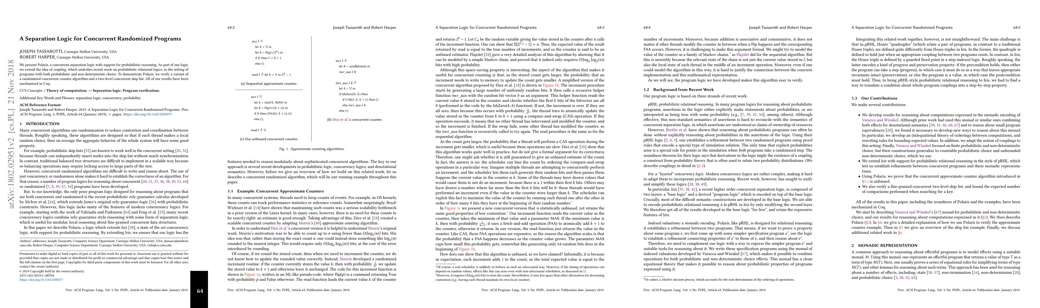 This paper introduces Polaris, a concurrent separation logic designed for probabilistic reasoning in concurrent randomized programs, extending coupling for both probabilistic and non-deterministic choices. The logic is demonstrated through verified examples including a randomized concurrent counter and a two-level concurrent skip list, all mechanized in Coq.