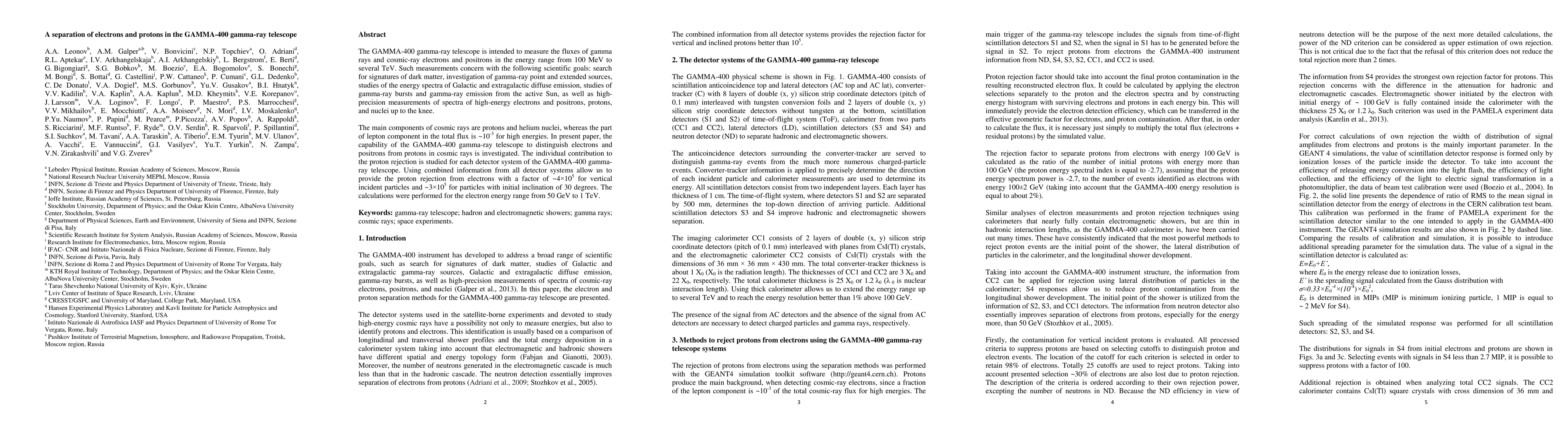 The GAMMA-400 telescope aims to measure gamma rays and cosmic-ray electrons and positrons, with a focus on distinguishing these particles from protons. The study shows that the telescope can reject protons from electrons with a factor of ~4x10^5 for vertical particles and ~3x10^5 for inclined particles in the energy range of 50 GeV to 1 TeV.