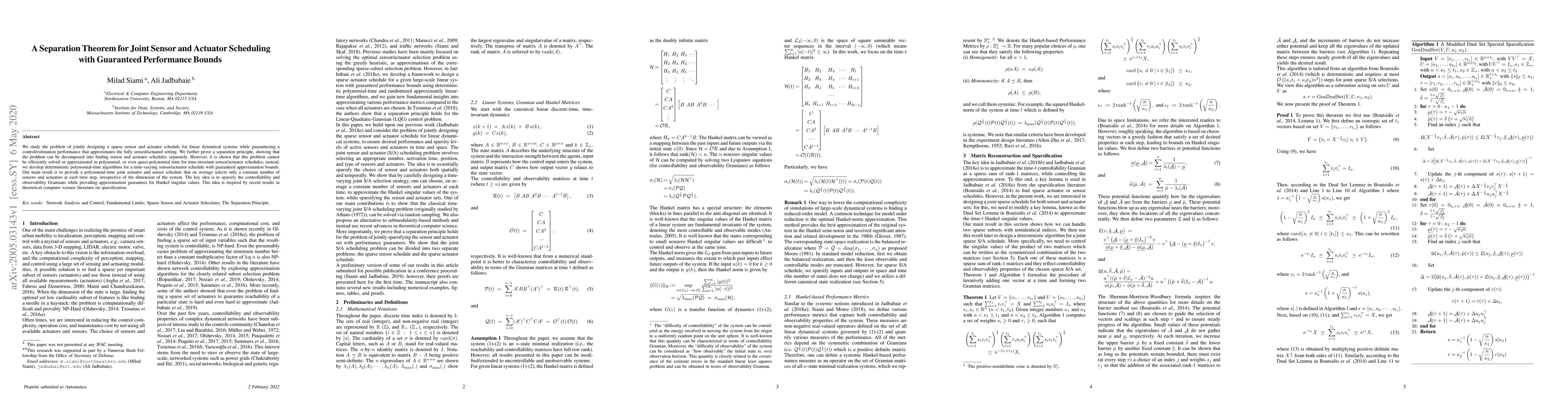 A new algorithm provides a polynomial-time solution for jointly scheduling sensors and actuators in linear dynamical systems while ensuring optimal performance. The approach sparsifies the system's controllability and observability Gramians to achieve guaranteed bounds.