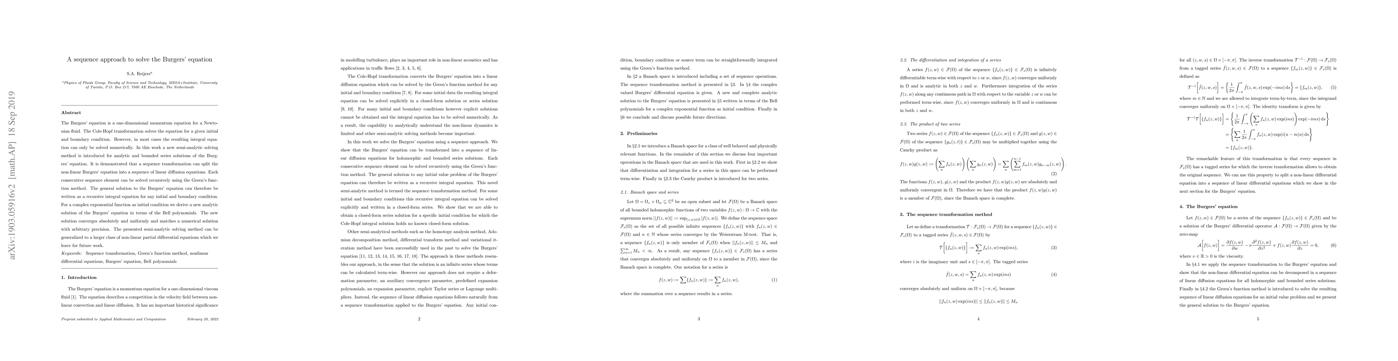 The Burgers' equation is a one-dimensional momentum equation for a Newtonian fluid. The Cole-Hopf transformation solves the equation for a given initial and boundary condition. However, in most cases the resulting integral equation can only be solved numerically. In this work a new semi-analytic solving method is introduced for analytic and bounded series solutions of the Burgers' equation. It is demonstrated that a sequence transformation can split the non-linear Burgers' equation into a sequence of linear diffusion equations. Each consecutive sequence element can be solved recursively using the Green's function method. The general solution to the Burgers' equation can therefore be written as a recursive integral equation for any initial and boundary condition. For a complex exponential function as initial condition we derive a new analytic solution of the Burgers' equation in terms of the Bell polynomials. The new solution converges absolutely and uniformly and matches a numerical solution with arbitrary precision. The presented semi-analytic solving method can be generalized to a larger class of non-linear partial differential equations which we leave for future work.