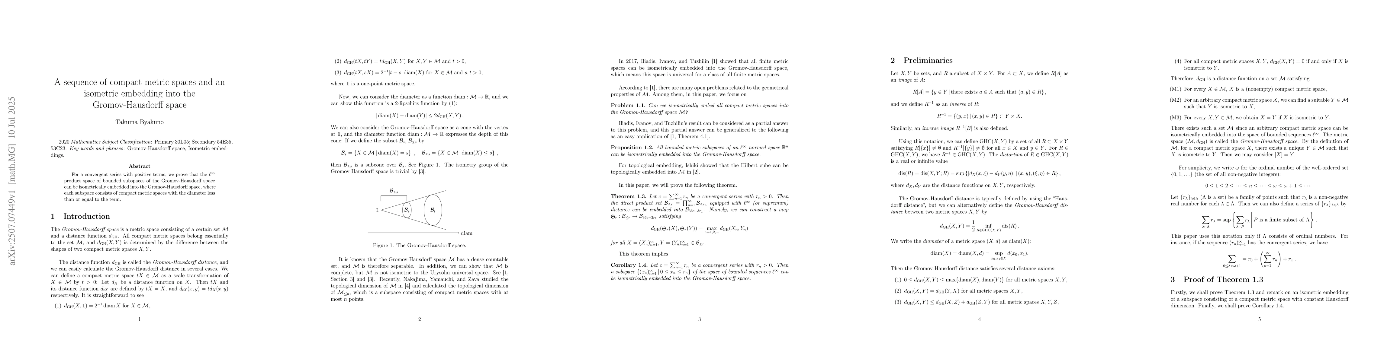 For a convergent series with positive terms, we prove that the $\ell^\infty$ product space of bounded subspaces of the Gromov-Hausdorff space can be isometrically embedded into the Gromov-Hausdorff space, where each subspace consists of compact metric spaces with the diameter less than or equal to the term.