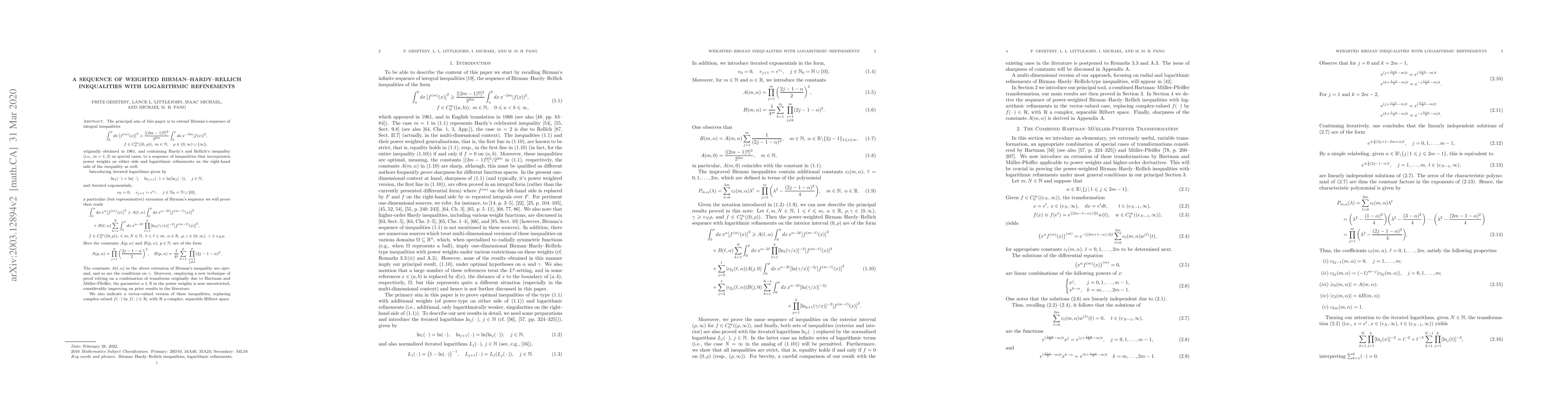 The principal aim of this paper is to extend Birman's sequence of integral inequalities originally obtained in 1961, and containing Hardy's and Rellich's inequality as special cases, to a sequence of inequalities that incorporates power weights on either side and logarithmic refinements on the right-hand side of the inequality as well. Our new technique of proof for this sequence of inequalities relies on a combination of transforms originally due to Hartman and M\"uller-Pfeiffer. The results obtained considerably improve on prior results in the literature.