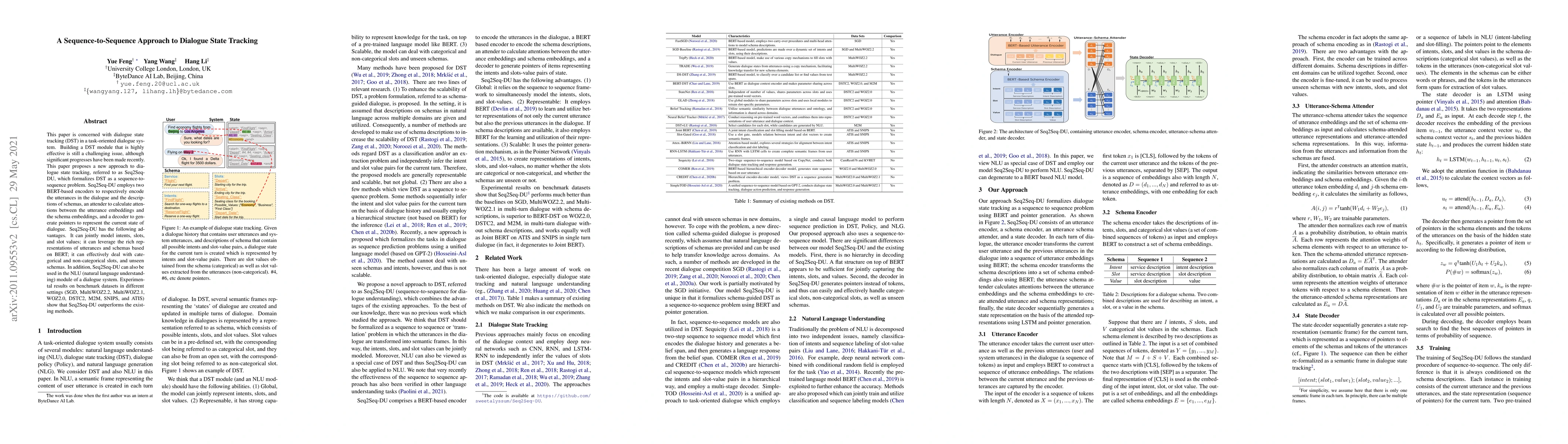 This paper introduces Seq2Seq-DU, a sequence-to-sequence approach for dialogue state tracking in task-oriented dialogue systems, leveraging BERT-based encoders and an attention mechanism. Experimental results demonstrate its superior performance over existing methods on multiple datasets.