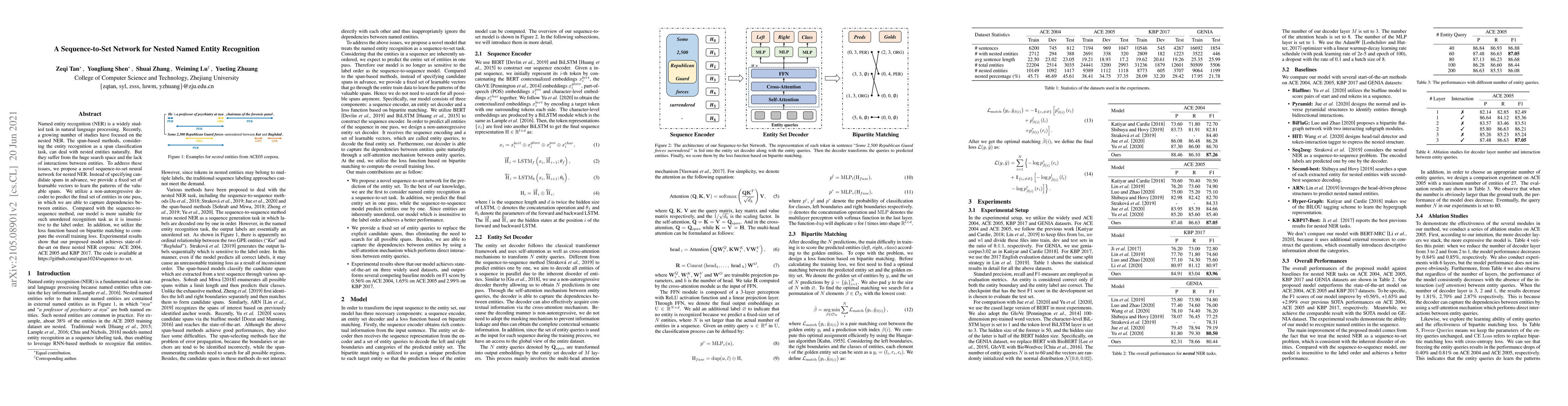 This paper proposes a sequence-to-set network for nested named entity recognition, addressing the challenges of span-based methods by using a fixed set of learnable vectors to identify valuable spans. The model captures entity dependencies through a non-autoregressive decoder and achieves state-of-the-art results on three nested NER corpora.
