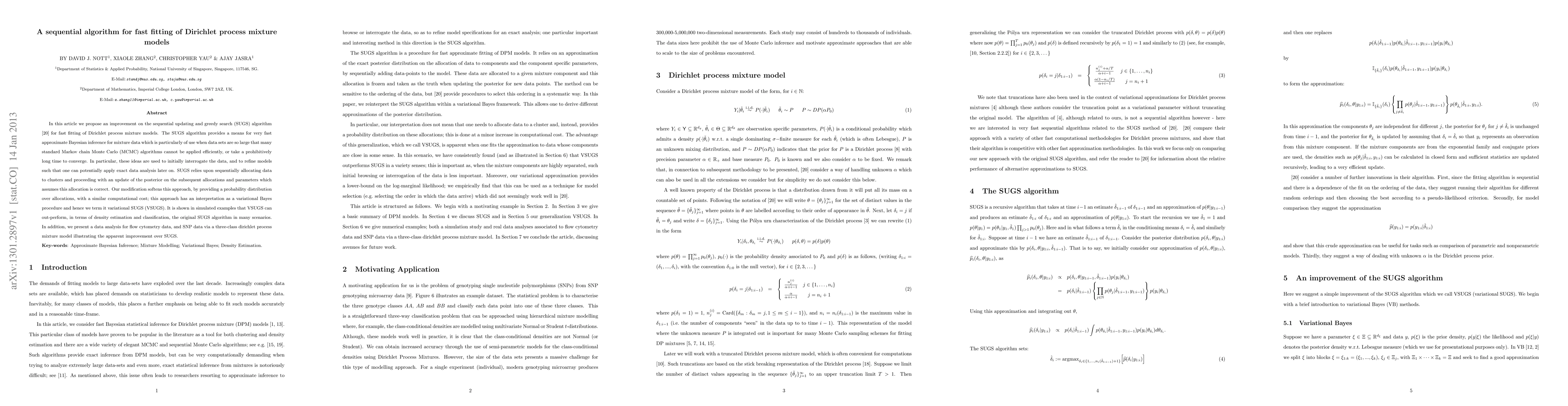 This paper proposes a variational SUGS (VSUGS) algorithm for fast fitting of Dirichlet process mixture models, improving upon the original SUGS method by providing a probability distribution over allocations instead of a single allocation. VSUGS demonstrates better density estimation and classification performance compared to SUGS in simulated examples and real-world data analysis.