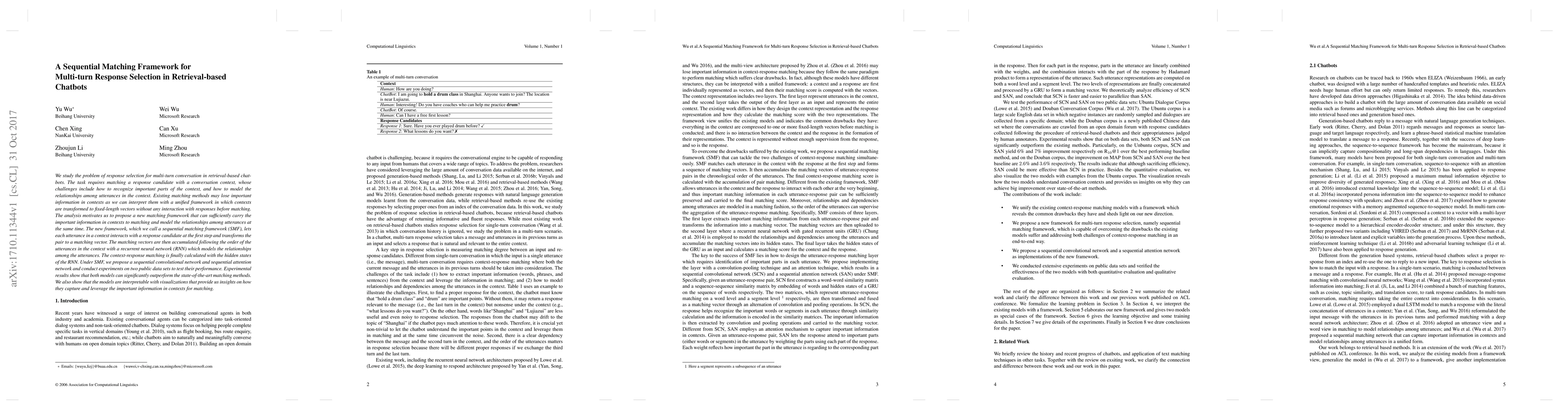 This paper proposes a sequential matching framework (SMF) for multi-turn response selection in retrieval-based chatbots, which sequentially matches each context utterance with response candidates, transforming them into matching vectors and accumulating these vectors using an RNN to model relationships. Experimental results show significant performance improvements over existing methods and provide insights into model interpretability.