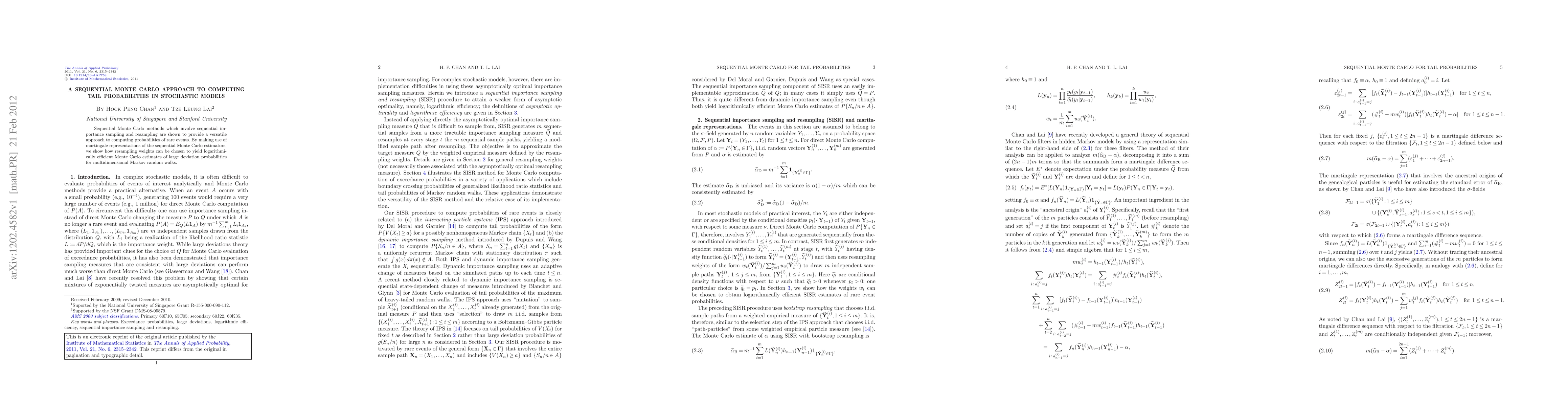 Summary: This paper proposes a sequential Monte Carlo method for efficiently computing tail probabilities of rare events in stochastic models, leveraging martingale representations to optimize resampling weights and achieve logarithmic efficiency for large deviation probabilities in multidimensional Markov random walks.