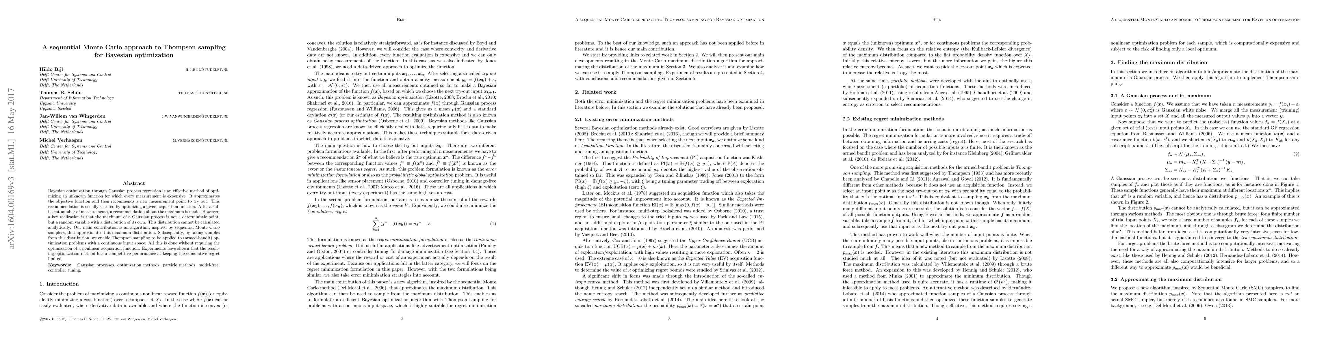 Bayesian optimization through Gaussian process regression is an effective method of optimizing an unknown function for which every measurement is expensive. It approximates the objective function and then recommends a new measurement point to try out. This recommendation is usually selected by optimizing a given acquisition function. After a sufficient number of measurements, a recommendation about the maximum is made. However, a key realization is that the maximum of a Gaussian process is not a deterministic point, but a random variable with a distribution of its own. This distribution cannot be calculated analytically. Our main contribution is an algorithm, inspired by sequential Monte Carlo samplers, that approximates this maximum distribution. Subsequently, by taking samples from this distribution, we enable Thompson sampling to be applied to (armed-bandit) optimization problems with a continuous input space. All this is done without requiring the optimization of a nonlinear acquisition function. Experiments have shown that the resulting optimization method has a competitive performance at keeping the cumulative regret limited.