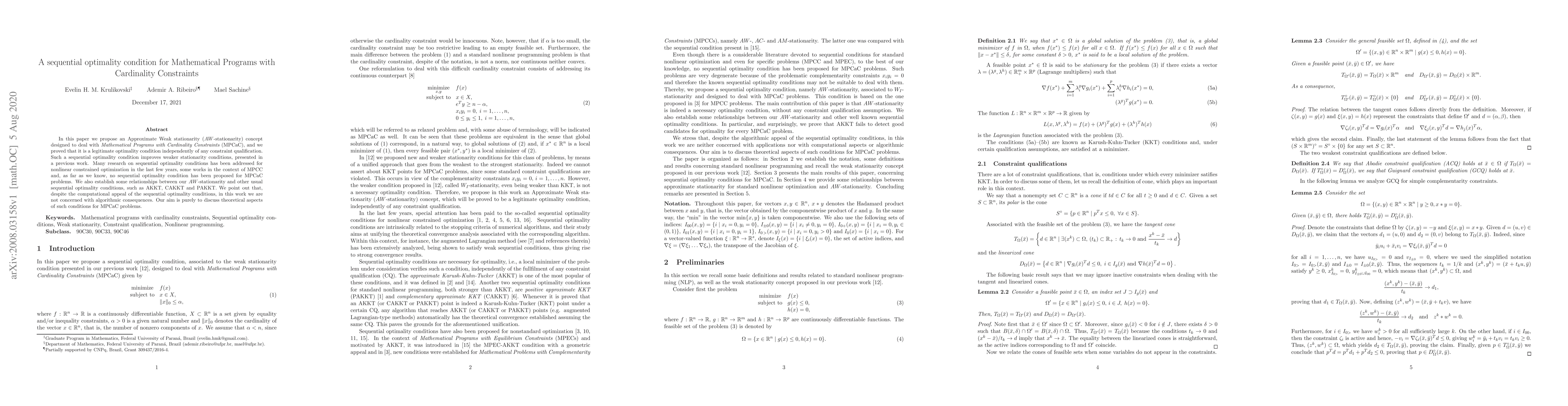 This paper proposes an Approximate Weak stationarity (AW-stationarity) concept for Mathematical Programs with Cardinality Constraints (MPCaC), proving it as a valid optimality condition without requiring constraint qualifications. It establishes relationships between AW-stationarity and other sequential optimality conditions, focusing purely on theoretical aspects rather than computational implications.