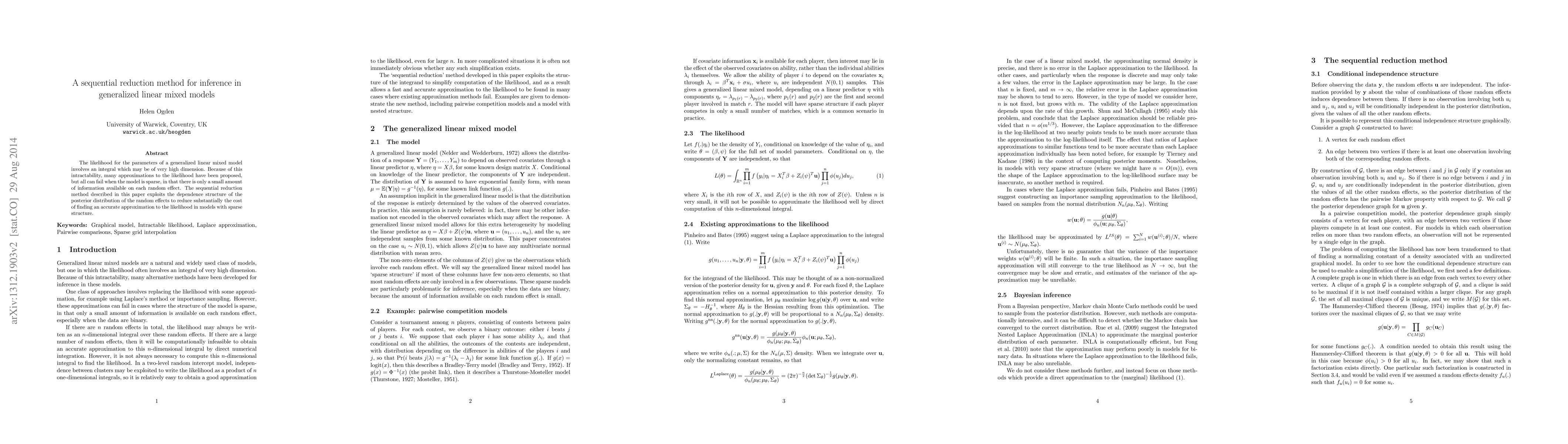 This paper proposes a sequential reduction method to efficiently approximate the likelihood in generalized linear mixed models, particularly when the model is sparse, by leveraging the dependence structure of the posterior distribution of random effects. This approach significantly reduces computational costs compared to existing methods.