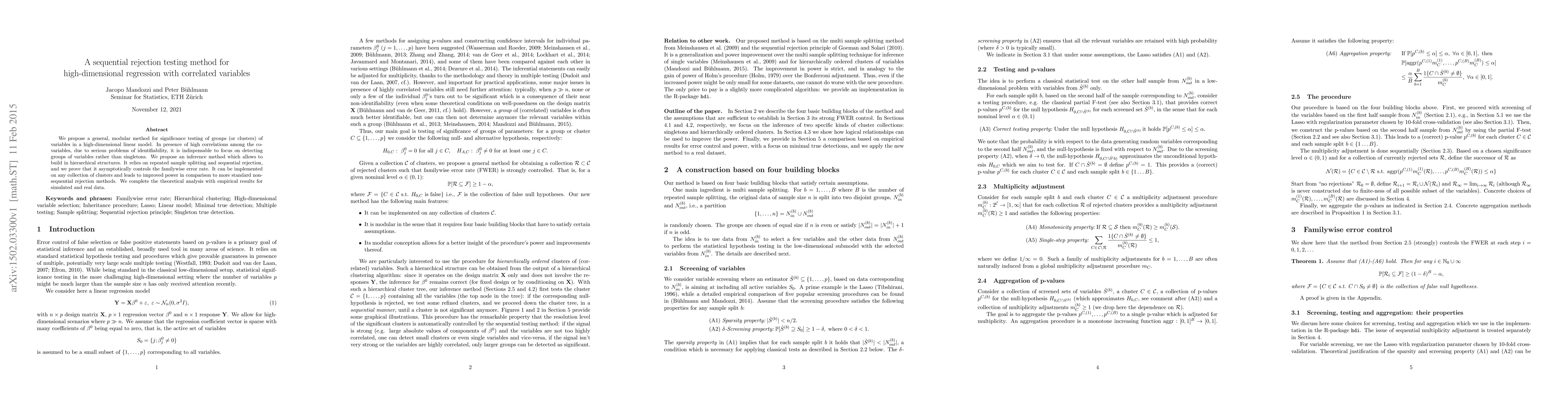 This paper proposes a sequential rejection testing method for high-dimensional regression with correlated variables, focusing on detecting groups rather than individual variables. The method uses hierarchical structures, repeated sample splitting, and sequential rejection to control the familywise error rate and improve power compared to standard methods.