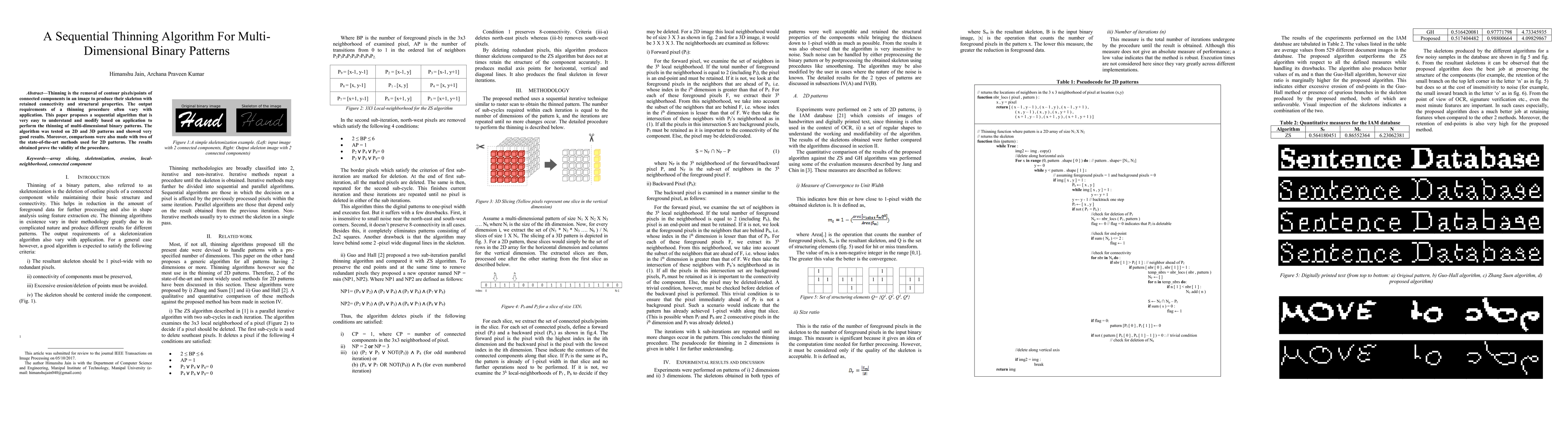 This paper proposes a straightforward sequential thinning algorithm for multi-dimensional binary patterns, demonstrating its effectiveness on both 2D and 3D patterns and comparing favorably with state-of-the-art 2D methods. The algorithm's flexibility and good results validate its practical utility.