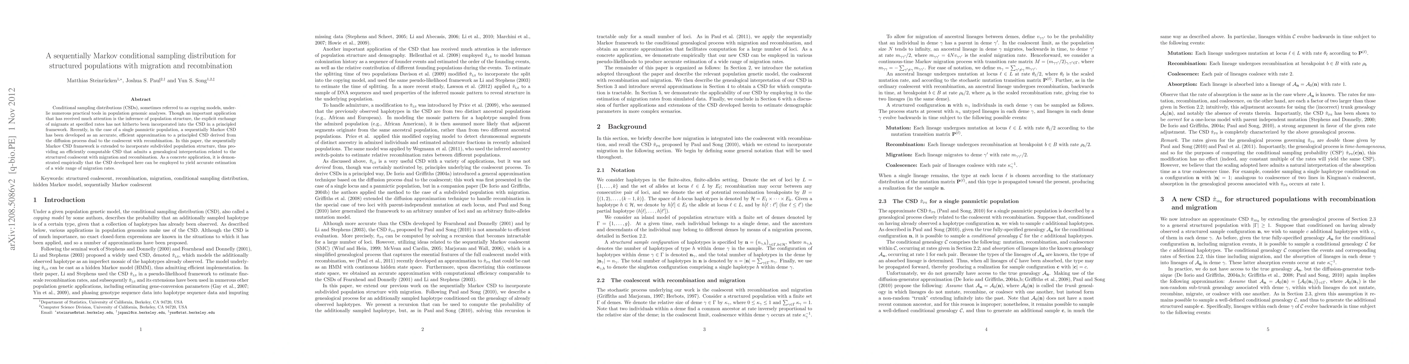 This paper extends the sequentially Markov conditional sampling distribution (CSD) framework to include population structure with migration and recombination, providing an efficient tool for estimating migration rates. The new CSD model offers a genealogical interpretation linked to the structured coalescent, demonstrating accurate empirical results in migration rate estimation.