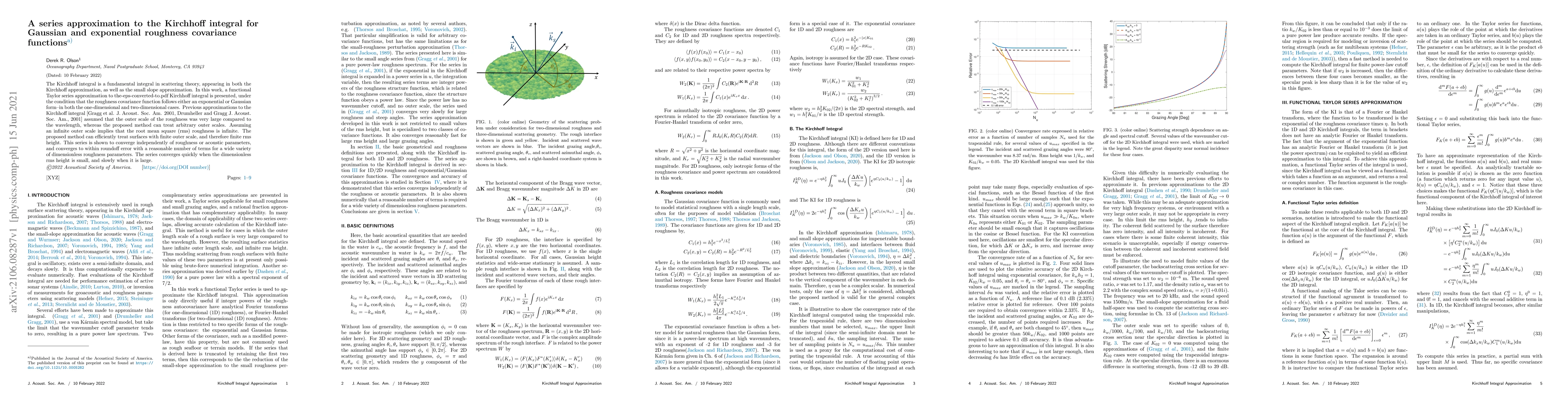 The Kirchhoff integral is a fundamental integral in scattering theory, appearing in both the Kirchhoff approximation, as well as the small slope approximation. In this work, a functional Taylor series approximation to the-eps-converted-to.pdf Kirchhoff integral is presented, under the condition that the roughness covariance function follows either an exponential or Gaussian form--in both the one-dimensional and two-dimensional cases. Previous approximations to the Kirchhoff integral [Gragg et al. J. Acoust. Soc. Am. 2001, Drumheller and Gragg J. Acoust. Soc. Am., 2001] assumed that the outer scale of the roughness was very large compared to the wavelength, whereas the proposed method can treat arbitrary outer scales. Assuming an infinite outer scale implies that the root mean square (rms) roughness is infinite. The proposed method can efficiently treat surfaces with finite outer scale, and therefore finite rms height. This series is shown to converge independently of roughness or acoustic parameters, and converges to within roundoff error with a reasonable number of terms for a wide variety of dimensionless roughness parameters. The series converges quickly when the dimensionless rms height is small, and slowly when it is large.