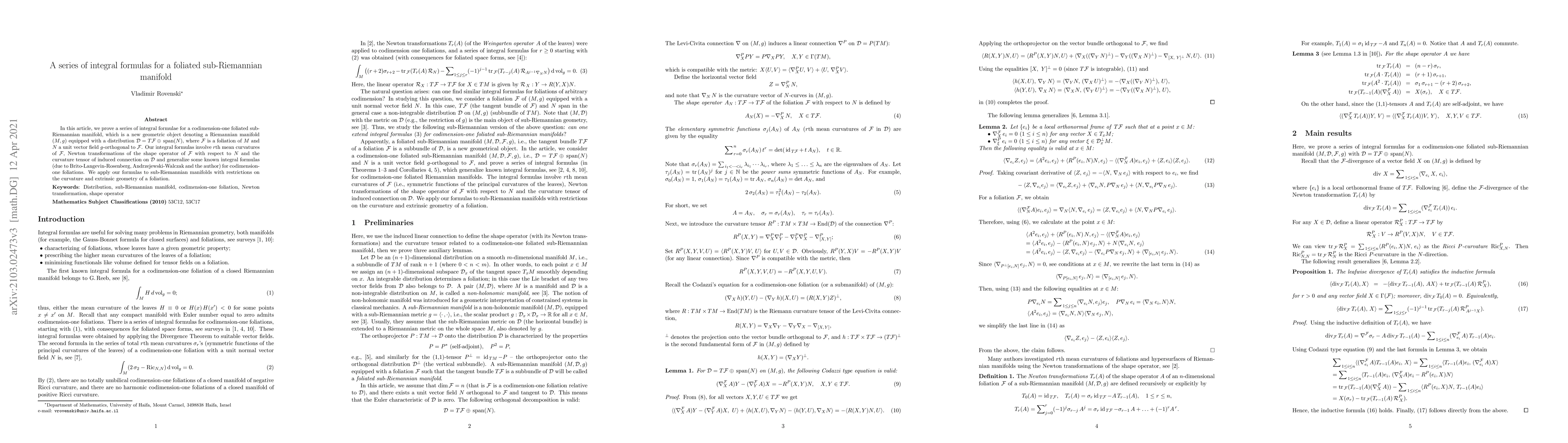 In this article, we prove a series of integral formulae for a codimension-one foliated sub-Riemannian manifold, i.e., a Riemannian manifold $(M,g)$ equipped with a distribution ${\mathcal D}=T{\mathcal F}\oplus\,{\rm span}(N)$, where ${\mathcal F}$ is a foliation of $M$ and $N$ a unit vector field $g$-orthogonal to ${\mathcal F}$. Our integral formulas involve $r$th mean curvatures of ${\mathcal F}$, Newton transformations of the shape operator of ${\mathcal F}$ with respect to $N$ and the curvature tensor of induced connection on ${\mathcal D}$ and generalize some known integral formulas (due to Brito-Langevin-Rosenberg, Andrzejewski-Walczak and the author) for codimension-one foliations. We apply our formulas to sub-Riemannian manifolds with restrictions on the curvature and extrinsic geometry of a foliation.