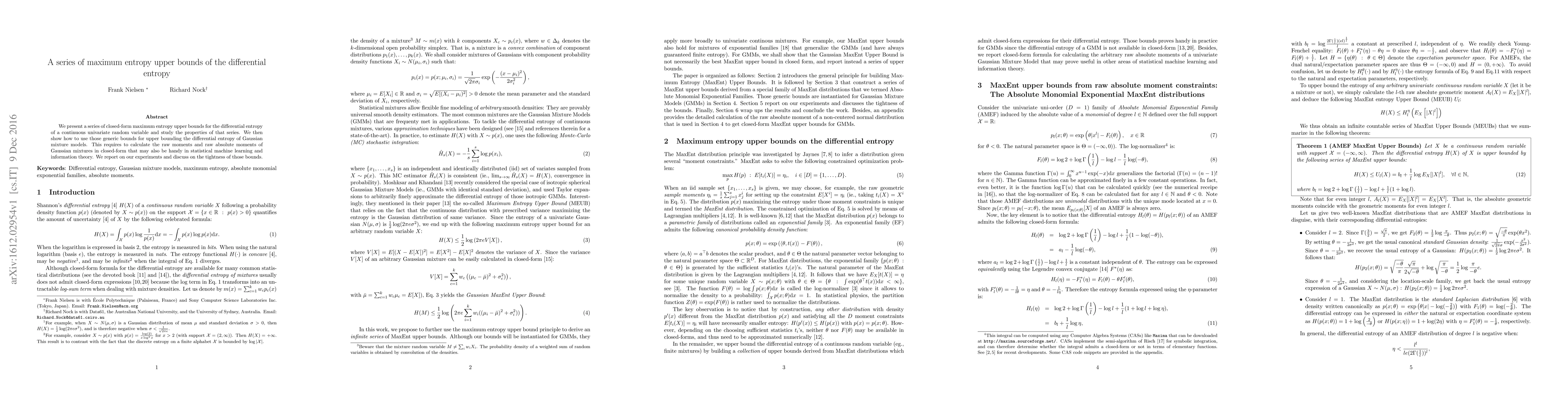 We present a series of closed-form maximum entropy upper bounds for the differential entropy of a continuous univariate random variable and study the properties of that series. We then show how to use those generic bounds for upper bounding the differential entropy of Gaussian mixture models. This requires to calculate the raw moments and raw absolute moments of Gaussian mixtures in closed-form that may also be handy in statistical machine learning and information theory. We report on our experiments and discuss on the tightness of those bounds.