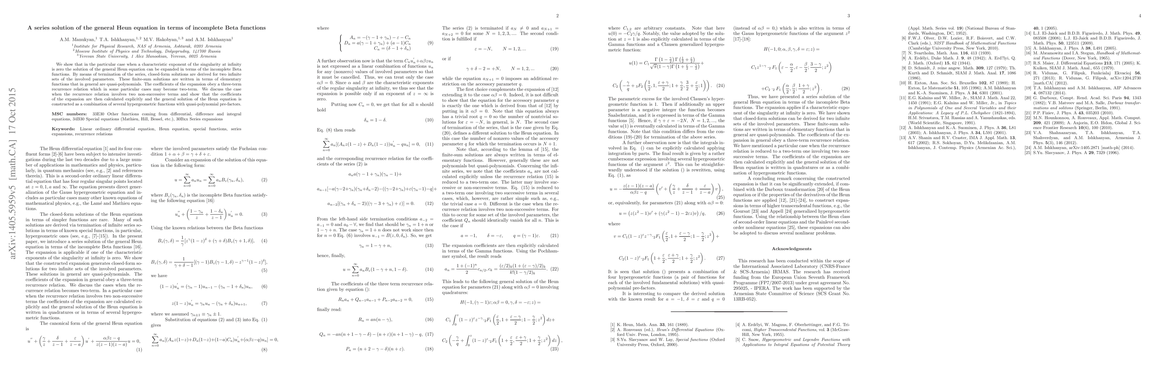 This paper presents a series solution of the general Heun equation using incomplete Beta functions when the singularity exponent at infinity is zero. It derives closed-form solutions for parameter sets through series termination, expressed as quasi-polynomials, and discusses the recurrence relation for coefficients, including cases where the relation involves non-successive terms.