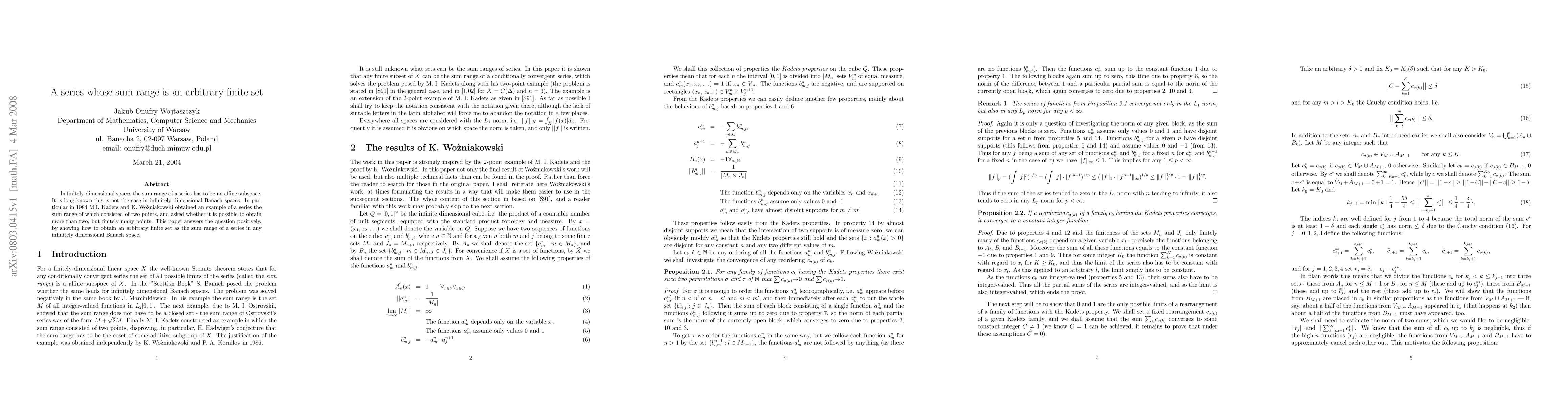 A research paper shows how to create a series in an infinitely dimensional Banach space with a sum range consisting of an arbitrary finite set of points, answering a question left open for over 30 years by Kadets and Wošniakowski.