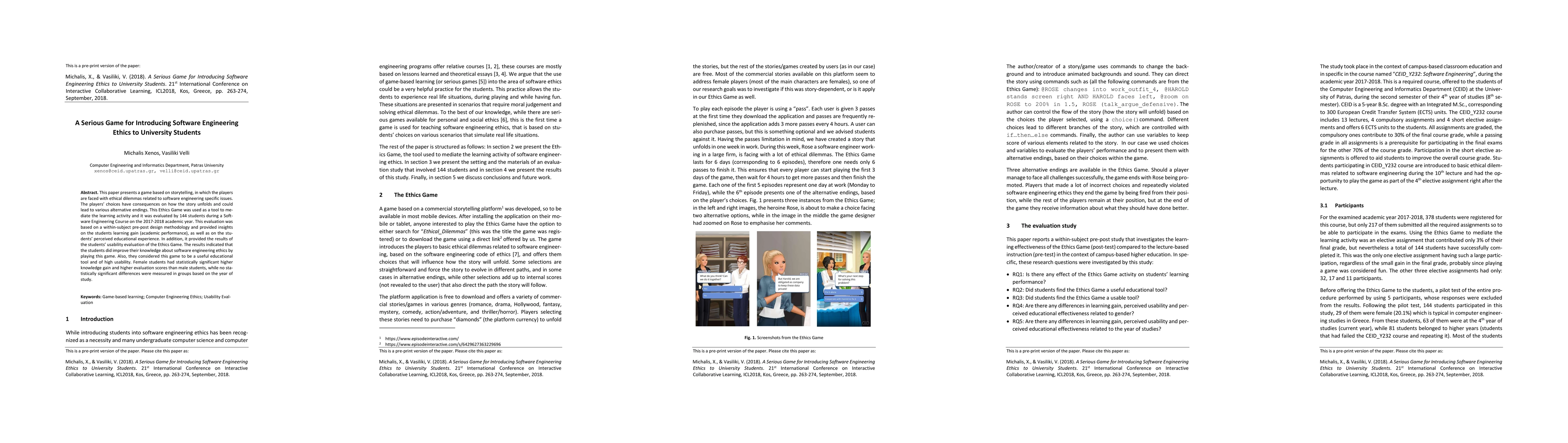 This research paper introduces a storytelling-based serious game designed to teach software engineering ethics to university students, finding that it effectively improved students' knowledge and was perceived as a useful and highly usable educational tool. Female students showed greater knowledge gain and higher evaluation scores compared to male students.