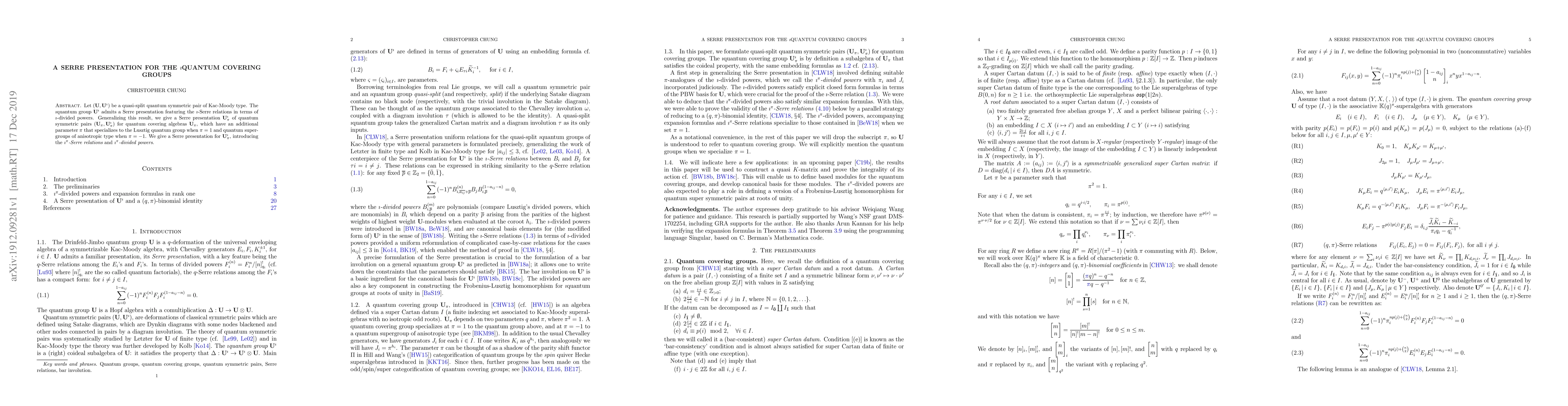 Let $(\mathbf{U}, \mathbf{U}^\imath)$ be a quasi-split quantum symmetric pair of Kac-Moody type. The $\imath$quantum group $\mathbf{U}^\imath$ admits a Serre presentation featuring the $\imath$-Serre relations in terms of $\imath$-divided powers. Generalizing this result, we give a Serre presentation $ \mathbf{U}^\imath_\pi $ of quantum symmetric pairs $ (\mathbf{U}_\pi, \mathbf{U}^\imath_\pi) $ for quantum covering algebras $\mathbf{U}_\pi$, which have an additional parameter $ \pi $ that specializes to the Lusztig quantum group when $ \pi = 1 $ and quantum supergroups of anisotropic type when $ \pi = -1 $. We give a Serre presentation for $ \mathbf{U}^\imath_\pi $, introducing the $\imath^\pi$-Serre relations and $\imath^\pi$-divided powers.