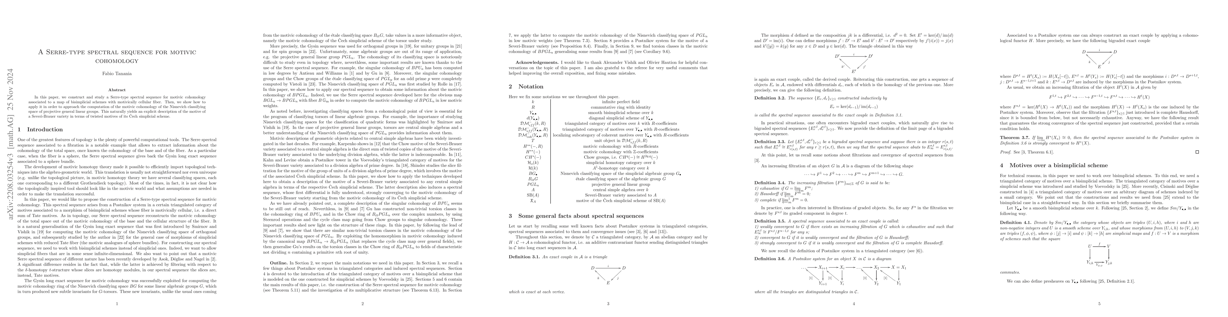 This paper constructs a Serre-type spectral sequence for motivic cohomology linked to a map of bisimplicial schemes with cellular fiber. It applies this spectral sequence to compute the motivic cohomology of the Nisnevich classifying space of projective general linear groups, yielding an explicit description of the motive of a Severi-Brauer variety in terms of twisted motives.